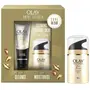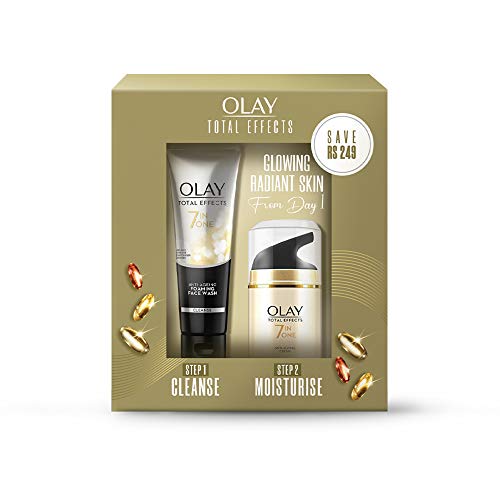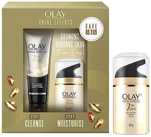 Olay Total Effect Day Cream (Spf 15) 50g & Cleanser Pack For Anti Ageing 100gInternational bestseller skincare brand Olay has engineered a range of products that promises the perfect skin for all ages and across skin types. Olay total effects delivers optimal hydration to nourish skin and visibly fight the 7 signs of aging (smoothens evens tone brightens refines pores reduces age spots restores firmness moisturises). vitamin B5 is an anti-inflammitory and skin conditioner boosts collagen and treats acne. Vitamin B3 renews your cell and holds skin moisture. Anti-oxidants vitamin c vitamin e and green tea clears skin prevents aging and protects from harmful radicals of the environment. Visible skin results from day 1. Start with the youthful glow for your skin now with total effects moisturiser. Directions for use: using your fingertips massage a small amount on the face and neck in an upward circular motion focusing on areas like the brow and jaw line which need more support.Olay Total Effects Day Cream With Vitamin B5 Niacinamide Green Tea Spf 15 Fights With Uv Protection For Normal Dry Oily & Combination Skin 50 GmInternational bestseller Skincare Brand Olay has engineered a range of products that promises the perfect skin for all ages and across skin types. Olay Total Effects delivers optimal hydration to nourish skin âand visibly fight the 7 signs of aging (Smoothes Evens Tone Brightens Refines Pores Reduces Age Spots Restores â Firmness Moisturises)â. Vitamin B5 is an anti-inflammitory and skin conditioner boosts collagen and treats acne. Vitamin B3 renews your cell and holds skin moisture. Anti-oxidants Vitamin C Vitamin E and Green Tea clears skin prevents aging and protects from harmful radicals of the environment. Visible Skin Results from Day 1. Start with the youthful glow for your skin now with Total Effects Moisturiser.