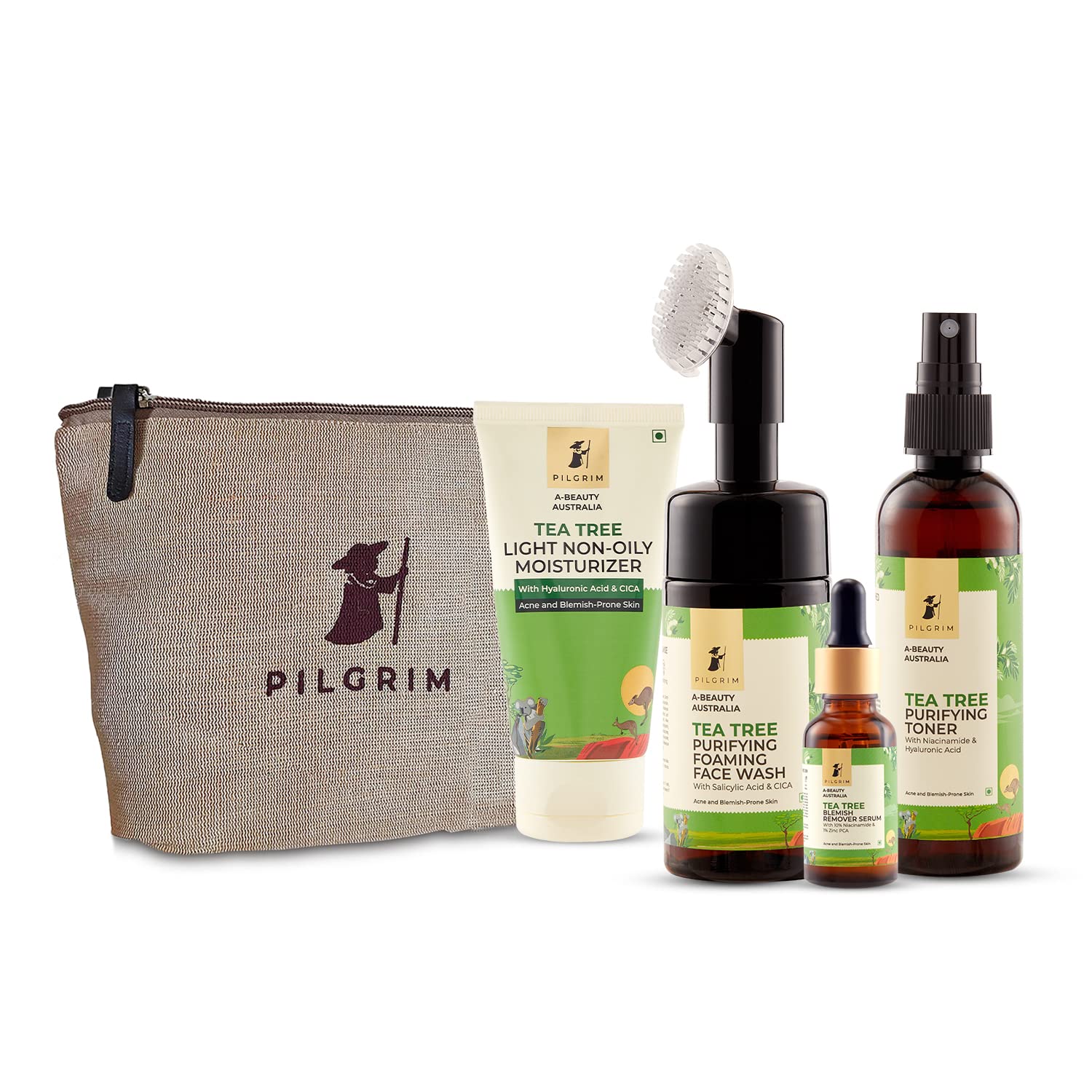 HomeBeautyFace CareMoisturizersFace Moisturizer & Day CreamPilgrim Tea Tree Night Ritual Premium for Acne-Free Skin with FREE JUTE BAG|Tea Tree & 1% Salicylic acid Foaming Face wash with brush 2% Niacinamide toner Gel moisturizer 10% Niacinamide serum.