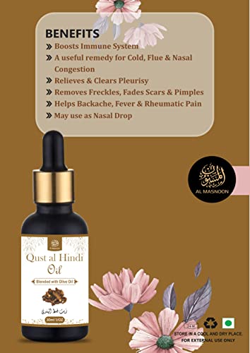 AL MASNOON Qust al Hindi Oil/Costus Root Oil Infused with Olive Oil 30ml(Pack of 1) 100% Natural & Pure