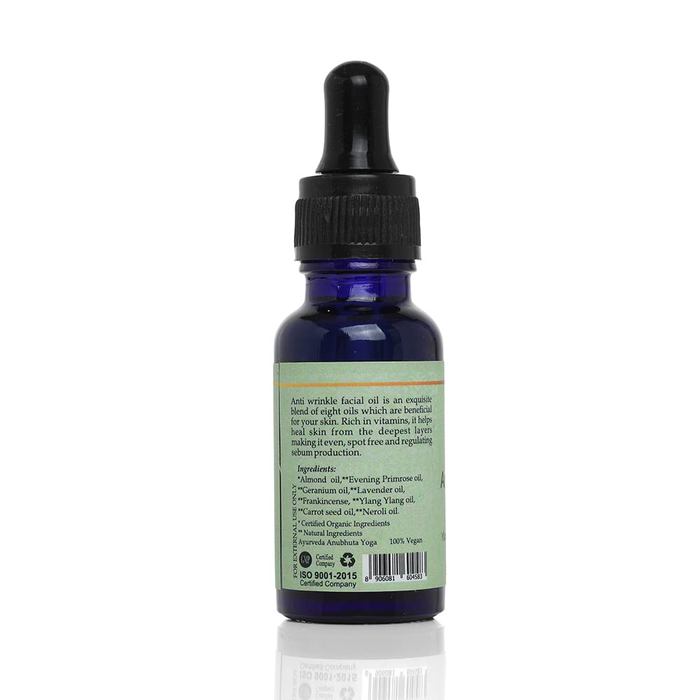 This Anti-wrinkle facial oil is an exquisite blend of eight oils that are beneficial for your skin. Rich in Vitamins it helps heal skin from the deepest layers making it even spot-free and regulating sebum production. Evening Primrose Oil has omega-6 and omega-9 acids which allow it to help the elasticity of the skin - addressing dryness irritation and wrinkles. The Geranium Oil here has antibacterial antimicrobial and antiseptic properties which makes it a great solution for acne breakouts.Lavender Oil has the ability to lessen acnereduce wrinkles and radiate your skin. Frankincense Oil is said to treat dry skin and reduce the appearance of wrinkles scars spots and any marks on your face. Ylang Ylang Oil reduces inflammation and scar healing. Along with its regenerative qualities Neroli Oil is also anti-septic antibacterial and anti-inflammatory. Carrot Seed Oil is loaded with great anti-aging properties while Almond Oil is all for hydration and healing of your skin. Massage face and neck with anti-wrinkle facial oil preferably at bedtime or an hour before bath time.