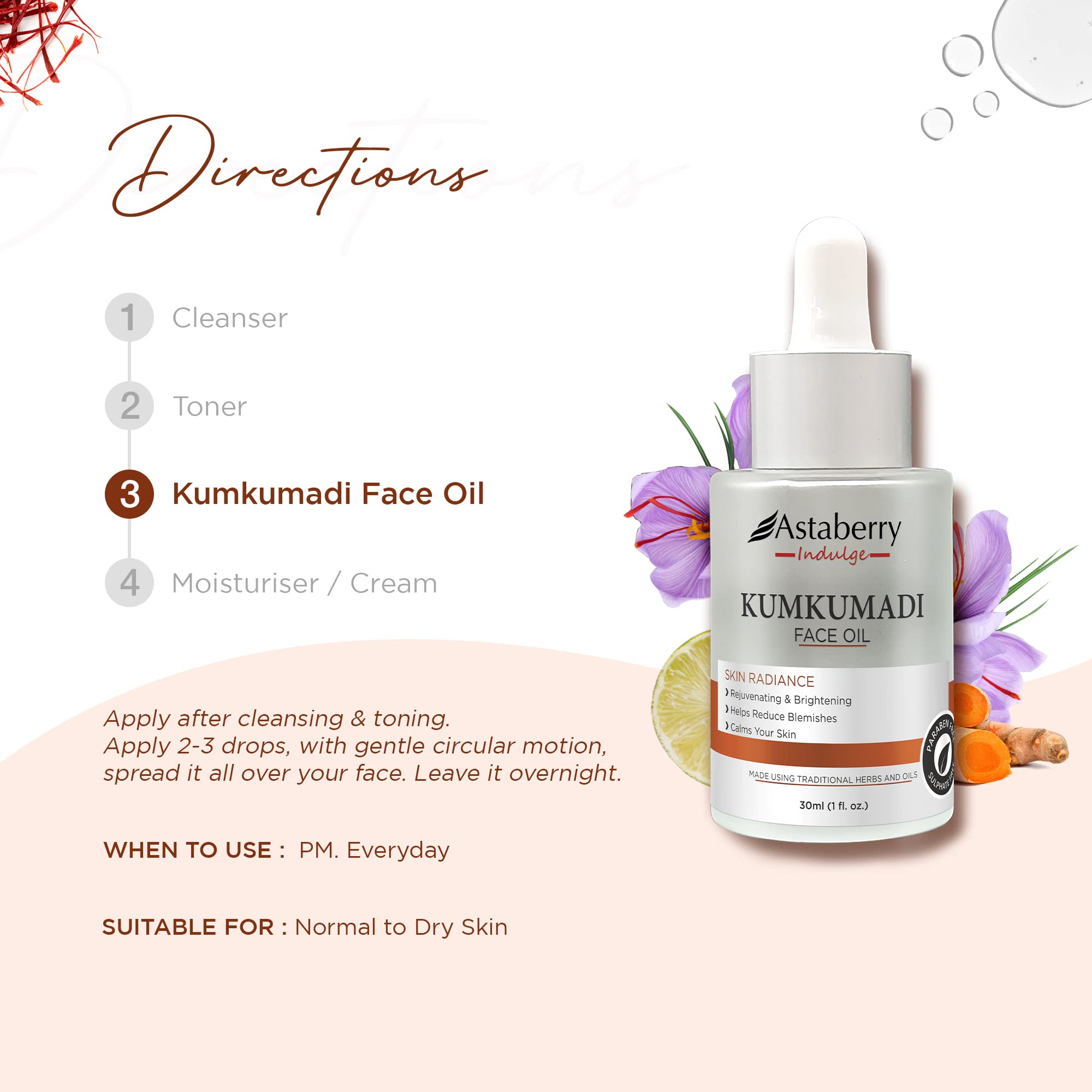 Astaberry Indulge Kumkumadi Face Oil for Glowing Skin With Saffron & Lotus Extracts For Dull Skin Sandalwood & Mulethi For Reduces Dark Spots & Blemishes | 30 ml