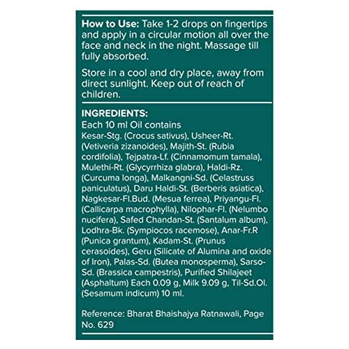 • 100% AYURVEDIC FORMULATION: Jiva Kumkumadi Oil is enriched with powerful Ayurvedic herbs such as Kesar Haldi Chandan Shilajit Nilophar and Nagkesar. The combined goodness of these pure ingredients in this Ayurvedic oil helps provide radiant & rejuvenated