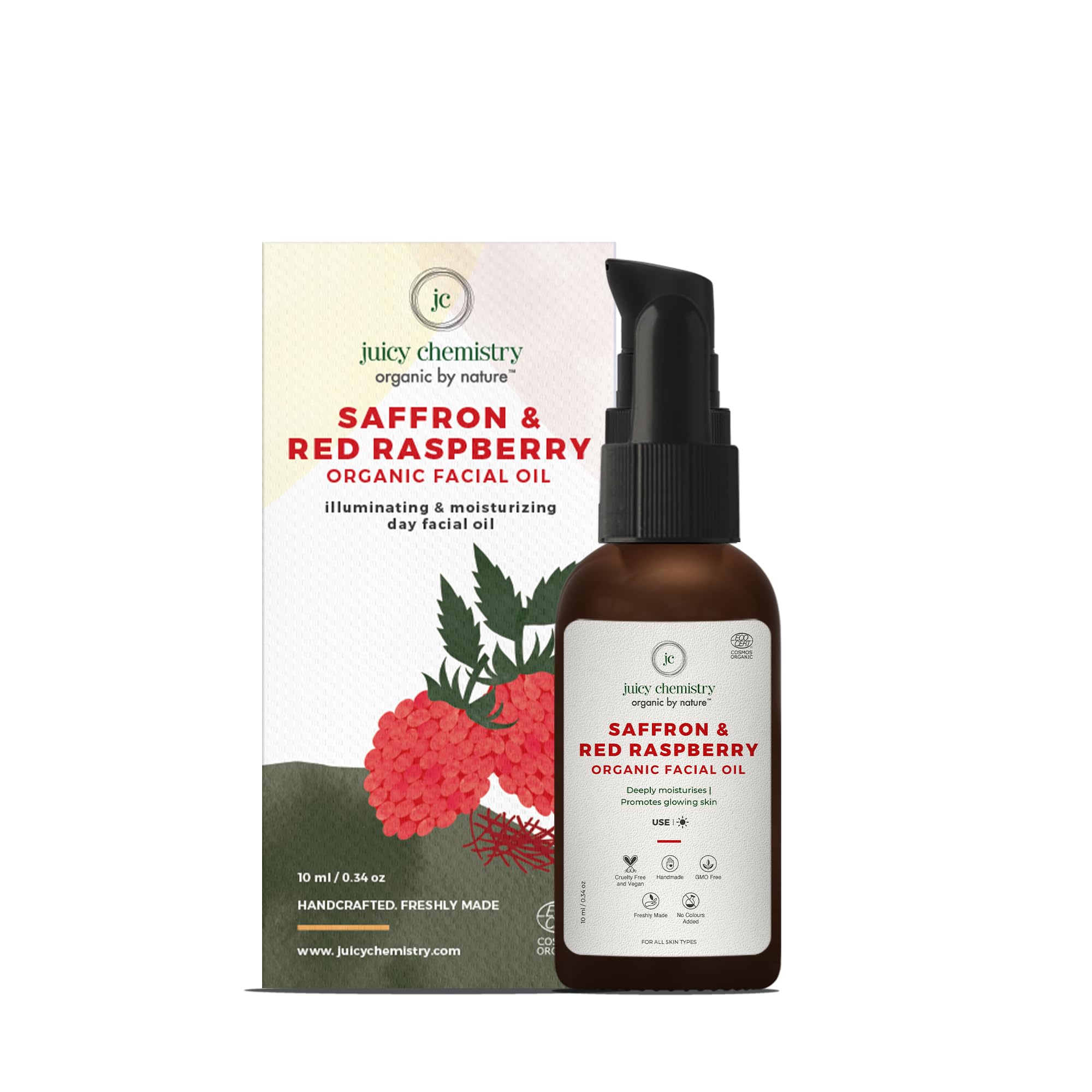 HomeBeautyFace CareMoisturizersFace OilsJuicy Chemistry Saffron & Red Raspberry Facial Oil, 10 ml | Organic Face Oil for Skin Brightening & Moisturising | Ecocert Certified for Men & Women | Cruelty-free & 100% Vegan