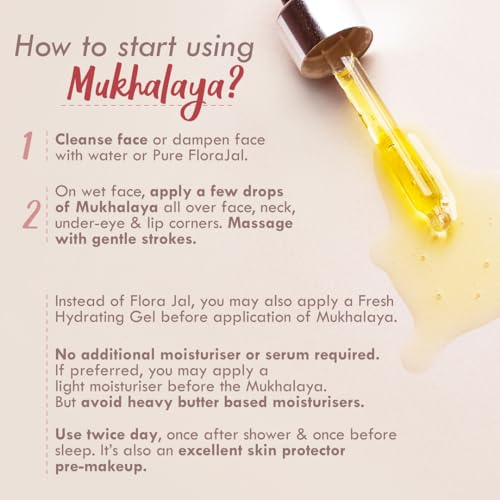 • How To Use-Cleanse face or dampen face with water or Pure Flora Jal-Toner. On a wet face apply a few drops of Mukhalaya all over the face neck under-eye & lip corners. Massage with gentle strokes. Instead of Flora Jal you may also apply a Fresh Hydrating