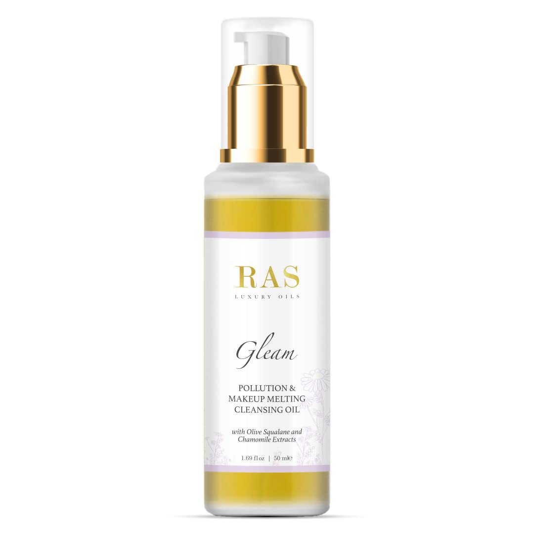 RAS Luxury Oils Gleam- Pollution & Makeup Melting Cleansing Oil; Enriched With Olive Oil, Moringa & Chamomile Extracts; Melts Makeup, Removes Dirt and Buildup, Calms & Brightens the Skin ; 50 ml