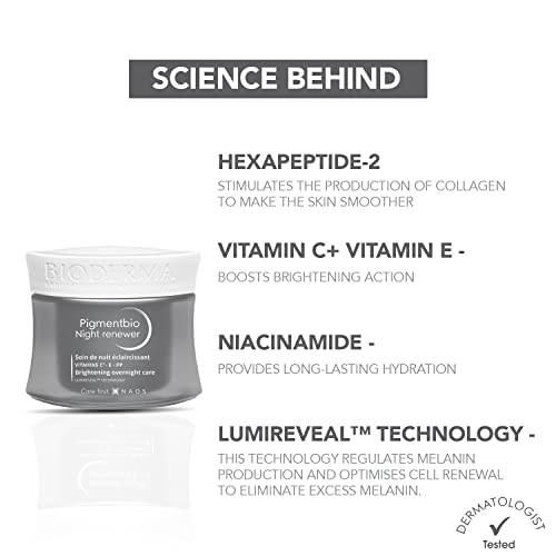 Pigmentbio Night Renewer features LUMIREVEAL TECHNOLOGY inspired by the dermatologistsâ reference treatments which reveals the brightness of the original complexion. It helps biologically reduce the production of melanin while boosting cell renewal for a corrective and preventive lightening effect. Improves skin barrier resistance.