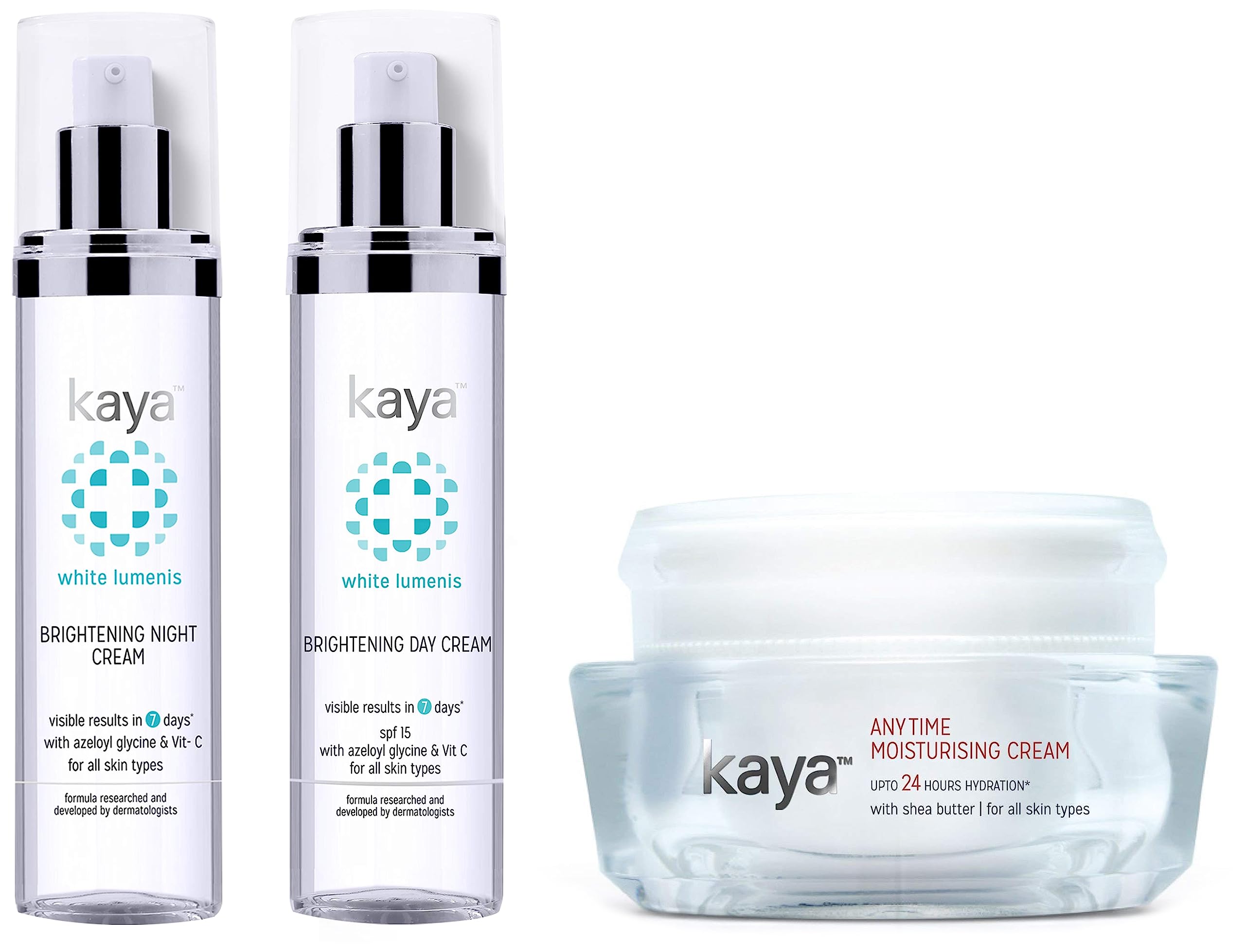 Kaya Brightening Day Cream | With Vitamin C & Azelaic Acid | Daily Use Moisturizer | SPF15 | Lightweight | Non Sticky | All Skin Types | 50mlBrightening your dull skin is now easy and hassle-free! Kaya Brightening Day Cream is your everyday companion for lighter brighter and flawless looking youthful skin in just 7 days* * Basis external study conductedKaya Anytime Moisturising Cream | Enriched With Shea Butter | Daily Use Cream | Lightweight Moisturizer | 24 Hours Hydration | All Skin Types | 50mlIf your skin is not healthy it will reflect on your complexion. The skin needs simple and adequate care to stay healthy and radiant. It requires a number of nutrients just like every other part of the body to remain healthy. Kaya Anytime Moisturizing Cream has a unique moisture-lock formula that keeps your skin moisturized and minimizes water loss from the skin keeping it soft and supple all day long.Kaya Brightening Night Cream | Azelaic Acid & Vitamin C Moisturizer For Visibly Brighter & Soft Skin | Hydrates Skin | All Skin Types | 50mlLooking for a product that can give you bright fresh skin every morning? Kaya Brightening Night Cream gives you a boost of nourishment so that you wake up to lighter & brighter skin in 7 days* * Basis external study conducted