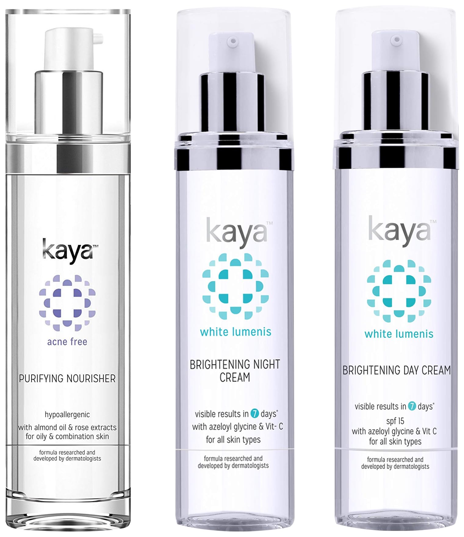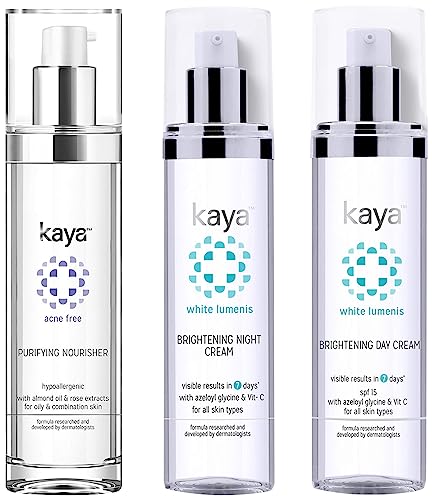 Kaya Brightening Day Cream | With Vitamin C & Azelaic Acid | Daily Use Moisturizer | SPF15 | Lightweight | Non Sticky | All Skin Types | 50mlBrightening your dull skin is now easy and hassle-free! Kaya Brightening Day Cream is your everyday companion for lighter brighter and flawless looking youthful skin in just 7 days* * Basis external study conductedKaya Clinic Acne Free Purifying Nourisher Gentle/light/non-greasy daily Moisturizer for oily & pimple prone skin 50 mlA gentle non-greasy water-based nourisher that leaves your skin supple and hydrated. It is Non-Comedogenic & Hypoallergenic making it suitable for acne prone skin. Aloe Vera helps reduce skin itchiness. Almond Oil & Rose Extract contains antioxidants to protect your skin from environmental factors.Kaya Brightening Night Cream | Azelaic Acid & Vitamin C Moisturizer For Visibly Brighter & Soft Skin | Hydrates Skin | All Skin Types | 50mlLooking for a product that can give you bright fresh skin every morning? Kaya Brightening Night Cream gives you a boost of nourishment so that you wake up to lighter & brighter skin in 7 days* * Basis external study conducted