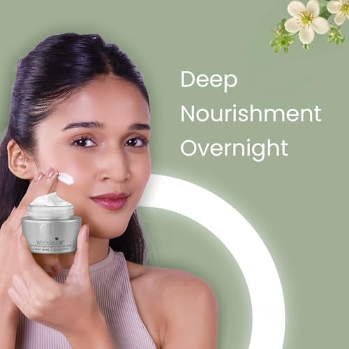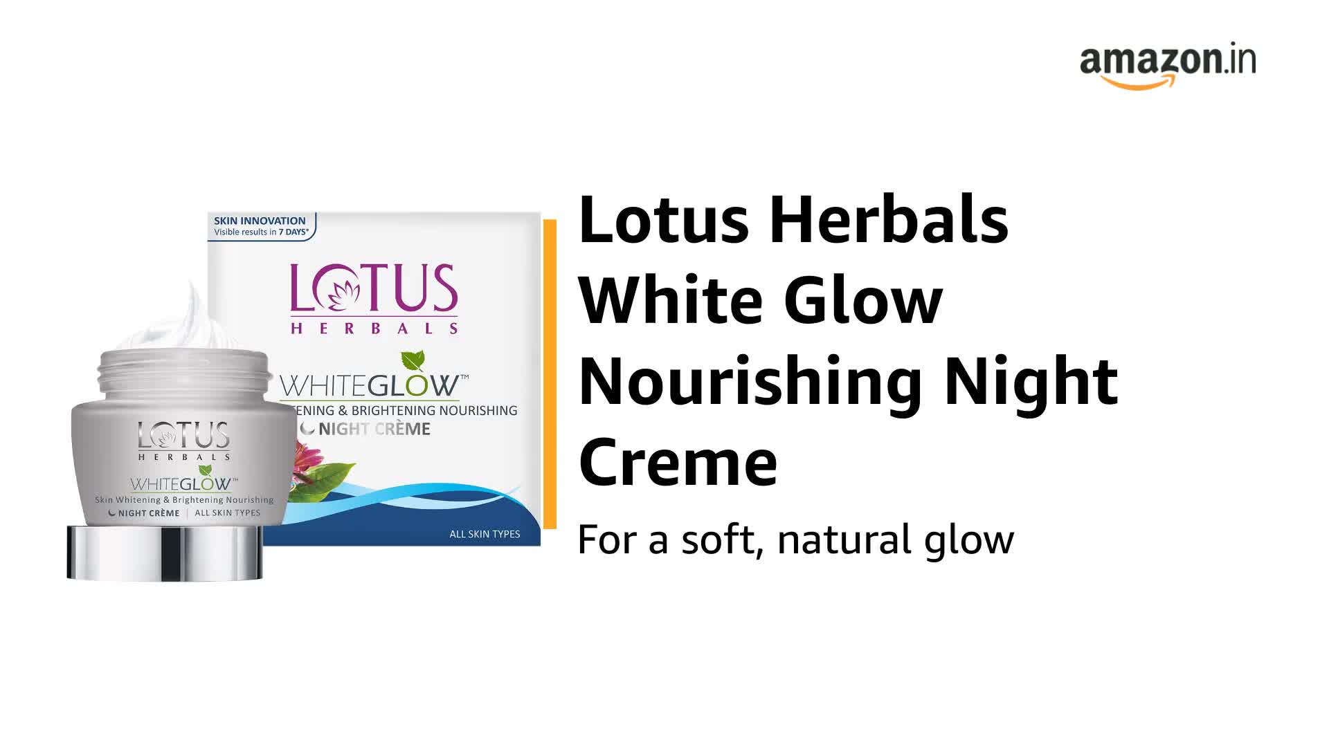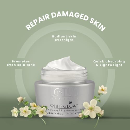 An advanced formula that is enriched with known fairness agents like grape mulberry saxifraga extracts and milk enzymes This unique formula blends the nourishing goodness of oil and the hydrating properties of water Helps to protect the skin from harmful UVA & UVB rays. The weather and pollution can wreak havoc on your skin especially facial skin which is always exposed. It can result in uneven pigmentation dark spots and dullness. Lotus Herbals White-Glow Skin Whitening and Brightening Nourishing Night Cream is a cream that works through the night to reduce pigmentation and adds glow to your skin.This cream lightens whitens and brightens your skin. It is an advanced formula containing fruit and herbal extracts that reduces pigmentation and nourishes skin overnight. In the morning your face is light white and glowing. This night cream acts on your skin to produce an even skin tone and enhances the skin's natural radiance. The product produces visible fairness within a week of regular use. It is thick and creamy and has a pleasant smell.Cleanse the skin before applying Lotus Herbals White-Glow Skin Whitening and Brightening Nourishing Night Cream. Use your fingers to apply the cream spreading it smoothly and evenly over your face and neck. It works through the night to give you the bright and glowing smooth youthful skin early in the morning.