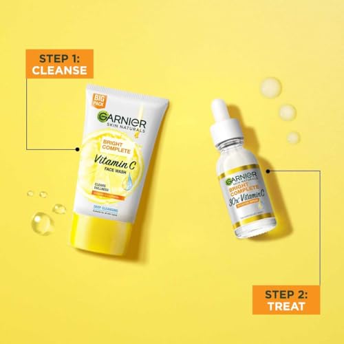 Bright Complete Serum: Introducing the NEW GARNIER LIGHT COMPLETE VITAMIN C BOOSTER SERUM Garnier Skin Naturalâs MOST CONCENTRATED brightening and spot reduction formula in a face serum. Enriched with the power of 30X VITAMIN C* and Lemons the lightweight and non-oily formula instantly penetrates into the skin. It give you an INSTANT GLOW and REDUCE SPOTS IN 3 DAYS (basis clinical test). Experience fast and visible results with Garnier Light Complete Vitamin C Booster Serum. Dermatologically tested and suitable for all skin types (*vs day cream). HOW TO USE - Cleanse your face with a mild Garnier Light Complete facewash and pat dry. Take a pea sized amount of the Vitamin C Booster Serum in your palms. Spread it between your palms without rubbing too much. Dab the serum all over your face and neck using small and gentle tapping motions. Follow with the Garnier Light Complete Serum Cream with SPF 40 in the morning and Light Complete Night Cream at night. For best results use daily. Bright Complete VITAMIN C Facewash: Cleanse remove impurities and get bright skin with Garnier Bright Complete Facewash. Enriched with the power of pure Yuzu Lemon Essence it contains Vitamin C which is known for its strong brightening exfoliating and anti-oxidant properties. These Yuzu Lemon extracts in this brightening facewash make it one of the best face washes for glowing skin. Suitable for daily use this facewash thoroughly cleanses your skin and helps brighten your skin after every wash. How to Use â Apply the Garnier Bright Complete Facewash on wet face lather and gently massage with fingertips. Avoid the eye contour area. Rinse thoroughly. Use twice a day for bright glowing skin. For best results follow it up with Garnier Bright Complete Vitamin C Booster Serum & Garnier Bright Complete Vitamin C Serum Cream.
