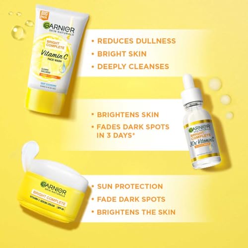 Garnier Bright Complete Vitamin C Brightening Regime Kit for Skincare | Cleanse, Treat and Seal | Reduces Dark Spots, Face Wash + Serum + SPF 40 Serum Cream, for all skin types, For Men and Women