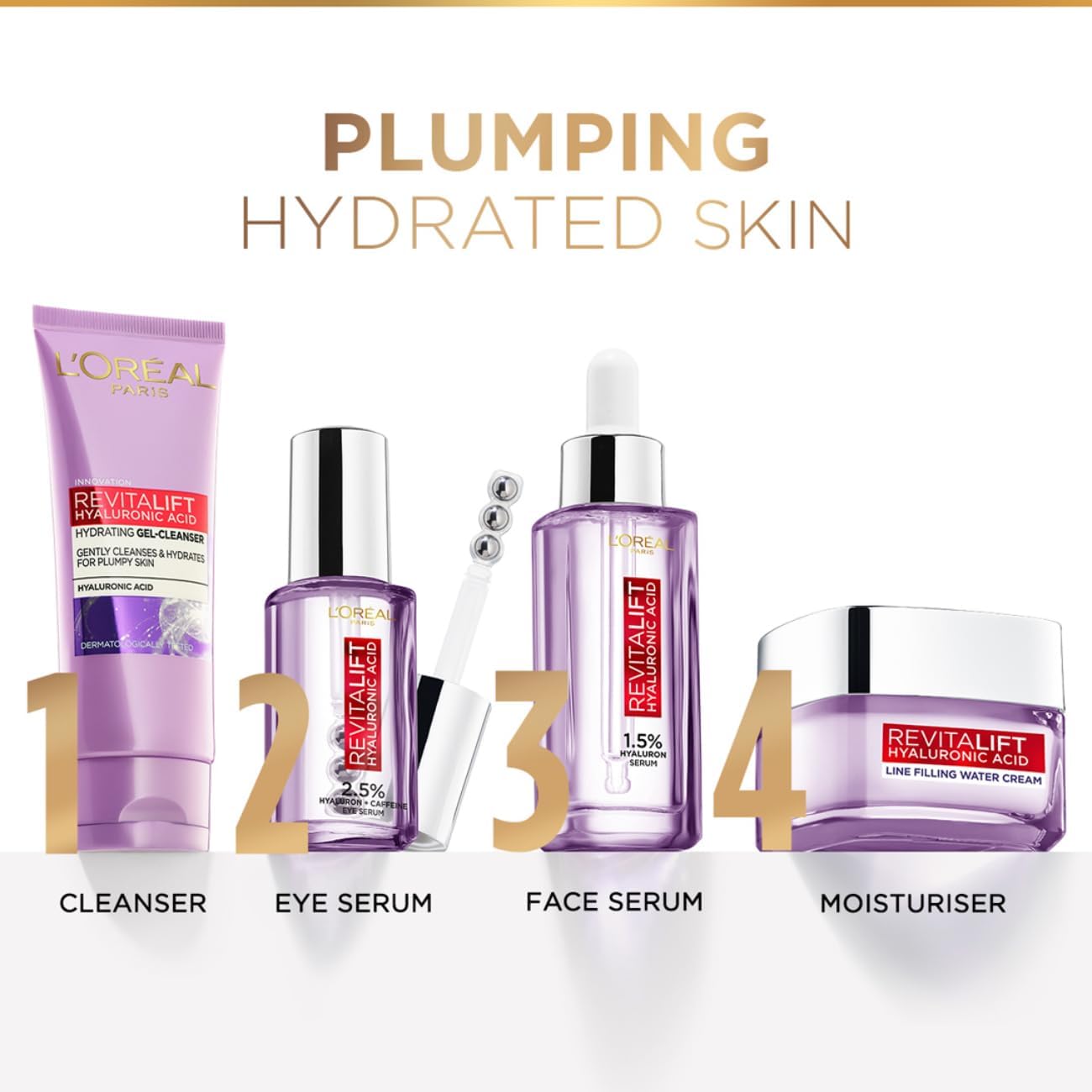 L'Oreal Paris Revitalift Serum Hydrating and Plumping With 1.5% Hyaluronic Acid 15mlTHE #1 Face Serum In the World* does what it says! The L'oreal Paris revitalift hyaluronic acid serum with 1.5% Hyaluron has micro hyaluronic acid for deeper penetration. It intense hydrates and reduces fine lines by -60%*. With this lightweight and non-sticky serum get visibly youthful skin! Dermatologically tested it is suitable for all skin types and can be used daily. This face serum for women is paraben- free fragrance-free & alcohol-free. And suitable for all skin types including sensitive skin. For best results use the hyaluronic acid cleanser follow by this serum followed by the hyaluronic acid plumping cream morning and night. Disclaimers: n°1 sell - out sales volume and value based on nielseniq rms data for the female face care anti-aging serum category total retail market 23 countries 75% of world gni jan 2021 to dec 21 (copyright © 2021 nielseniq)” **basis instrumental testL'Oreal Paris Day Cream for Women Hydrates and Replumps For Radiant Skin Revitalift Hyaluronic Acid 15mlGet plump hydrated and radiant skin with the new L'Oreal Paris Revitalift Hyaluronic Acid Plumping Gel Cream. Formulated with the highest concentration of Hyaluronic Acid the hyaluronic acid cream is made of micro Hyaluronic Acid that penetrates deeper for long lasting & visible results. The gel formula of the L'Oreal day cream combats the loss of moisture from your skin giving your skin a youthful radiance as well reduces the appearance of fine lines. The lightweight gel day cream is non-sticky and non-oily it will glide across the skin leaving behind a sensation of hydrated velvet skin. How to use – Take a pea sized amount of the L'Oreal Paris Hyaluronic Acid Cream and dot it all over freshly cleansed face and neck. Gently spread and massage the anti-ageing day cream in circular motions till the face cream gets completely absorbed into the skin. For best results combine usage with dermatologist validated L'Oreal Paris Revitalift 1.5% Hyaluronic Acid Serum. Suitable and a safe day cream for dry skin normal skin combination skin & early ageing skin. *Amongst Loreal Paris Creams