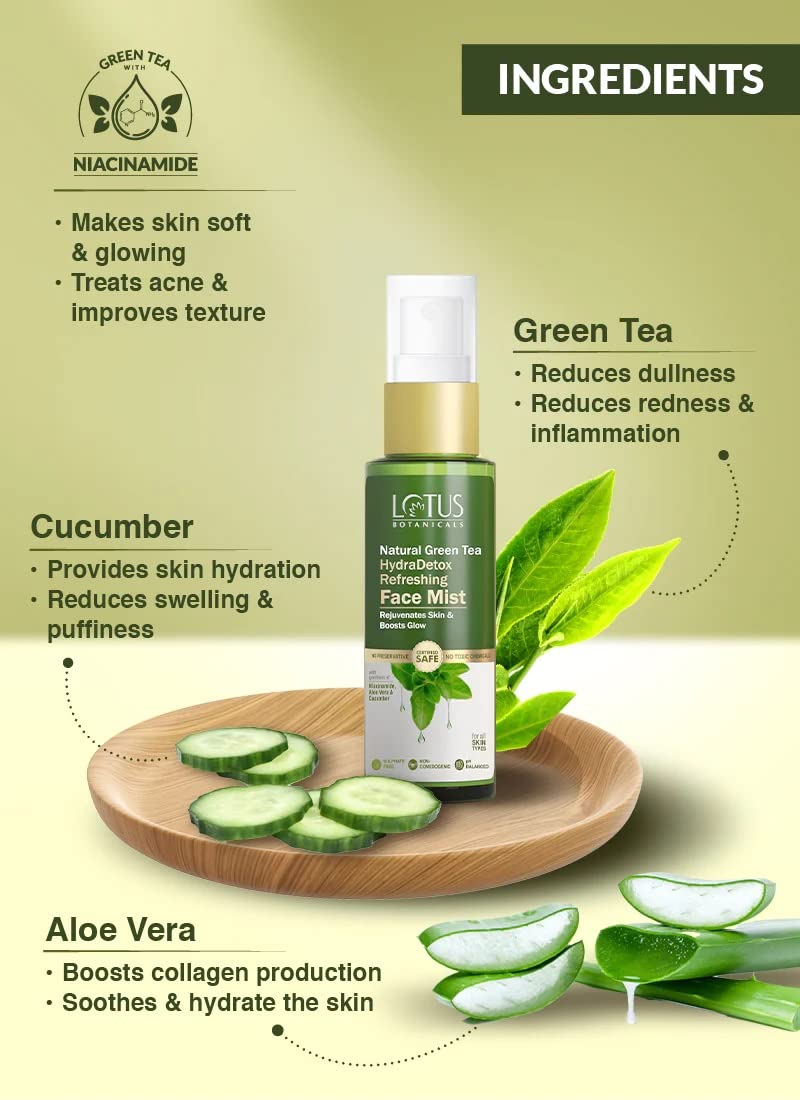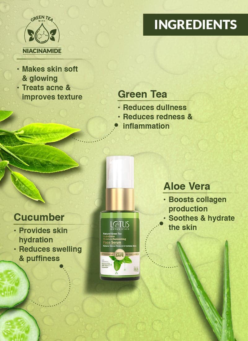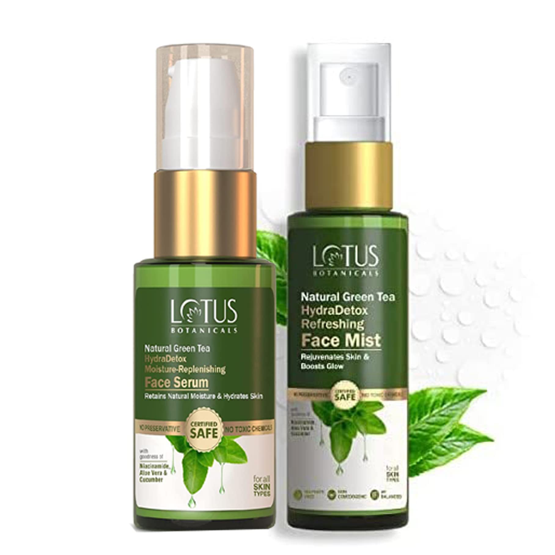 Spray your way to freshness with the Lotus Botanicals Natural Green Tea HydraDetox Refreshing Face Toner / Mist. Rich in antioxidants the mist provides a youthful and glowing skin while further toning up skin pores. Reviving your dull looking skin just became easier!Get the glowing skin of your dreams with the nourishment & hydration of Lotus Botanicals Natural Green Tea HydraDetox Moisture- Replenishing Face Serum protecting the outer barrier of your skin and replenishing skin's moisture and restoring it's natural freshness. The perfectly crafted formula with the richness of antioxidants helps in boosting the skin elasticity while fighting free radicals and signs of ageing.