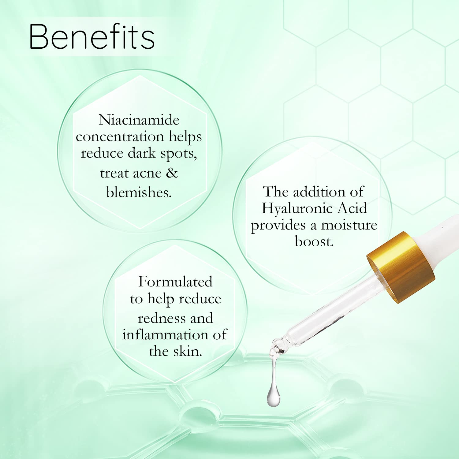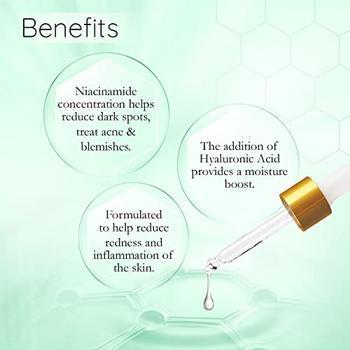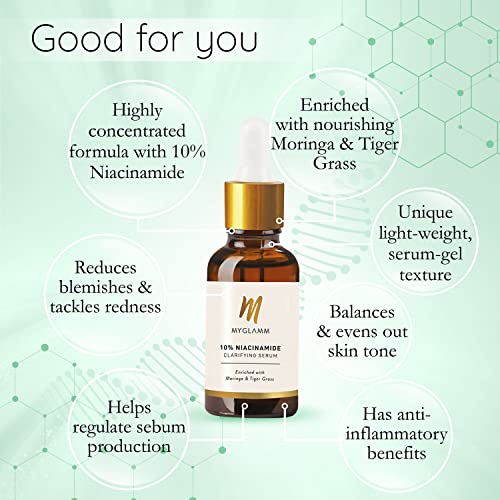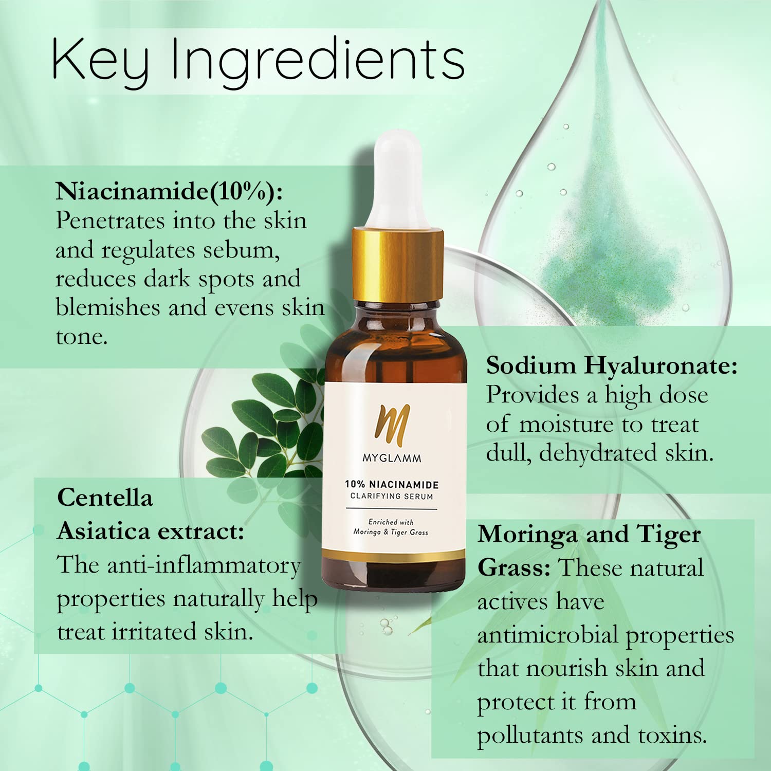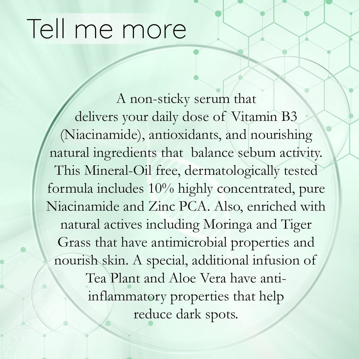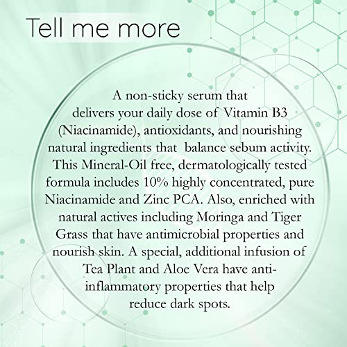 A non-sticky texture serum that delivers your daily dose of Vitamin B3 (Niacinamide) antioxidants and nourishing natural ingredients that balance sebum activity and intensely hydrate parched skin. This mineral-oil free dermatologically tested formula revitalizes your skin with 10% highly concentrated pure niacinamide and zinc PCA. This powerful component not only helps control oil production but also defends against redness and reduces blemishes dark spots and acne scars. The formula is enriched with natural actives including moringa and tiger grass that have antimicrobial properties and nourish skin. Additional ingredients include rose water which tones skin and zinc PCA which regulates sebum levels. A special additional infusion of tea plant and aloe vera have anti-inflammatory properties that help reduce dark spots. Hyaluronic acid is another active ingredient infused in this reliable formula. It provides multi-level hydration deeply replenishes dehydrated skin and makes it visibly smoother.