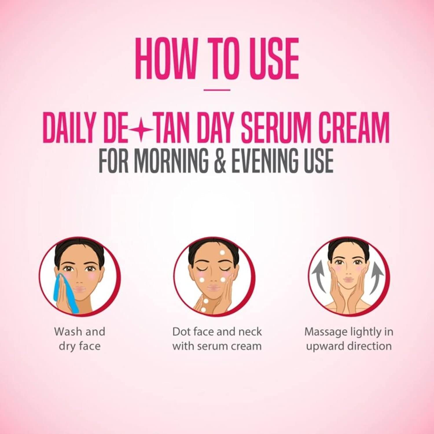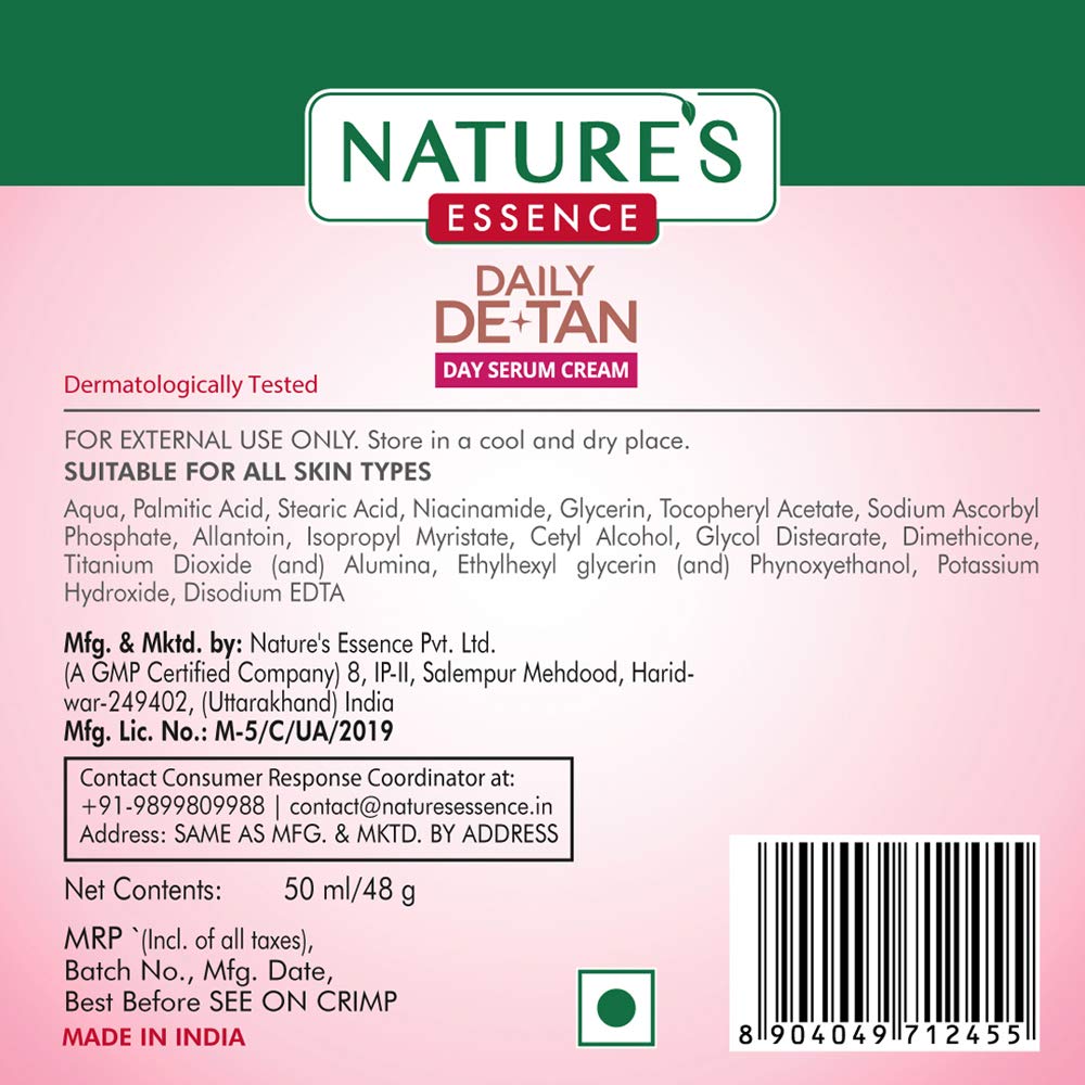 Nature's Essence daily De-Tan day serum cream goes deep into the skin to fight tan from within and gives you an all day glow. Use twice daily for best results.