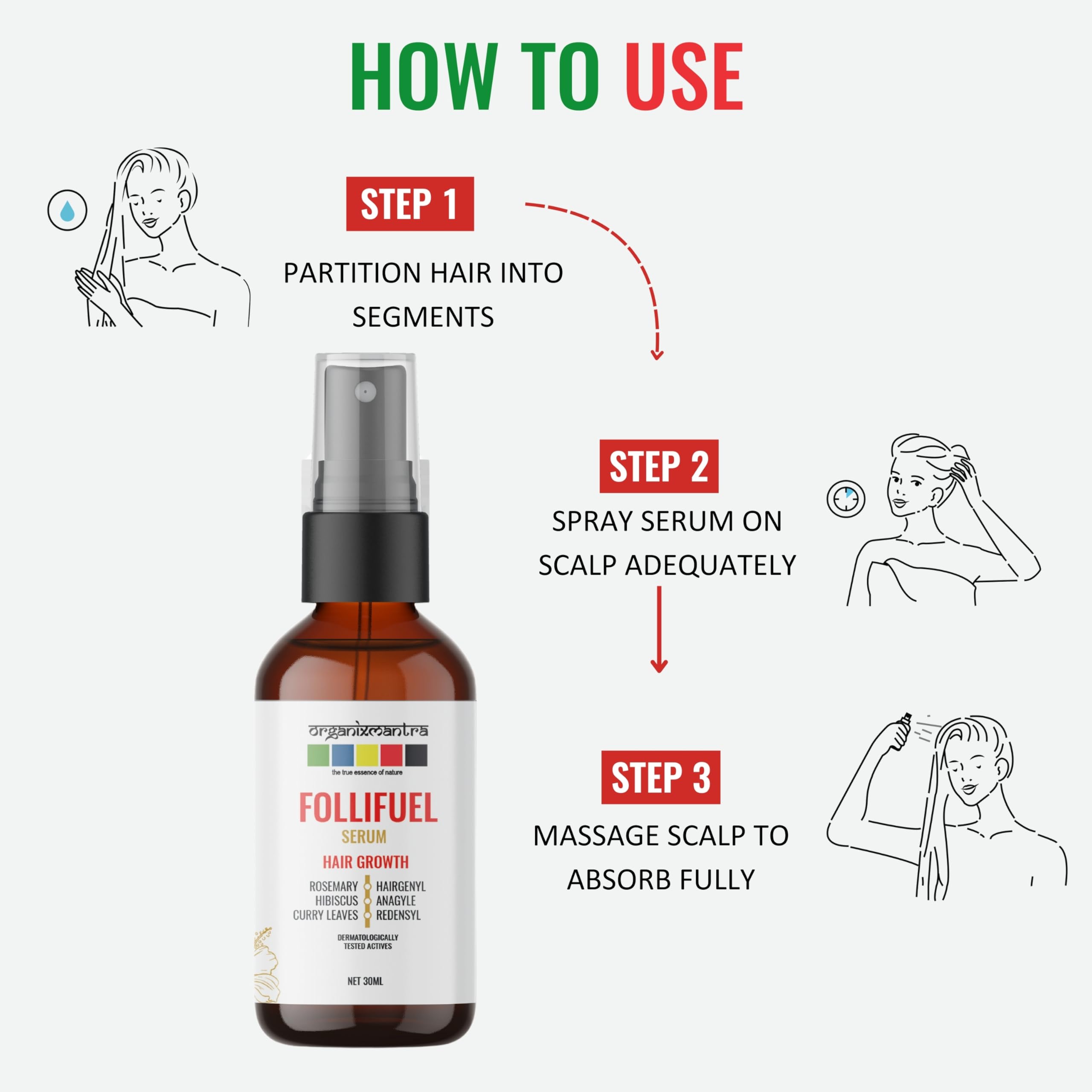 REVITALIZE YOUR ROOTS : Discover the Power of Nature + Science with Organix Mantra Follifuel Hair Serum. Enhance your hair growth with our advanced hair serum designed for both men and women. This advanced blend features scientifically proven ingredients