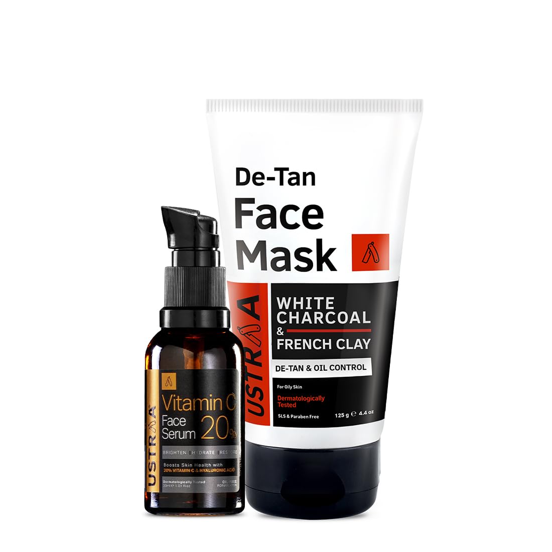 Ustraa 20% Vitamin C Face Serum with Hyaluronic Acid - For beating the effects of stress and pollution on your skin this is the ultimate solution. With 20% Vitamin C in its purest form this serum helps fight signs of aging brightens and hydrates the skin. With an oil-free formulation it provides nourishment without stickiness. Ustraa Face Mask - Oily Skin - This is a Face Mask designed to remove tanning and even out the skin tone. Skin that gets affected by prolonged sun exposure pollution and other irritants tends to gather impurities from the atmosphere which in the long run affects the skin and enhances aging. This Mask helps to remove those impurities from the face and keep the face looking fairer younger and healthier. It also helps in excess oil removal. It is not a peel-off mask so it can be washed away with water only.