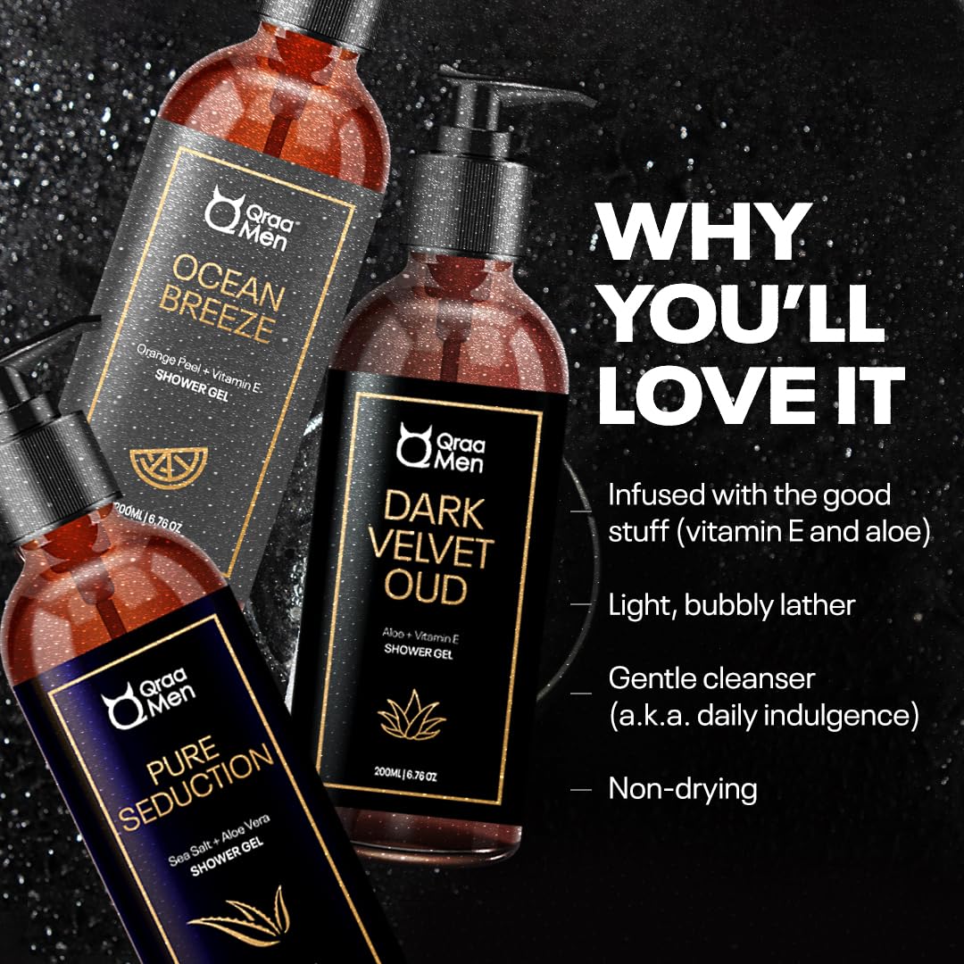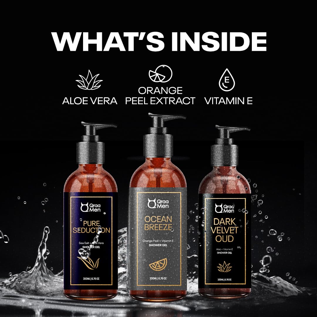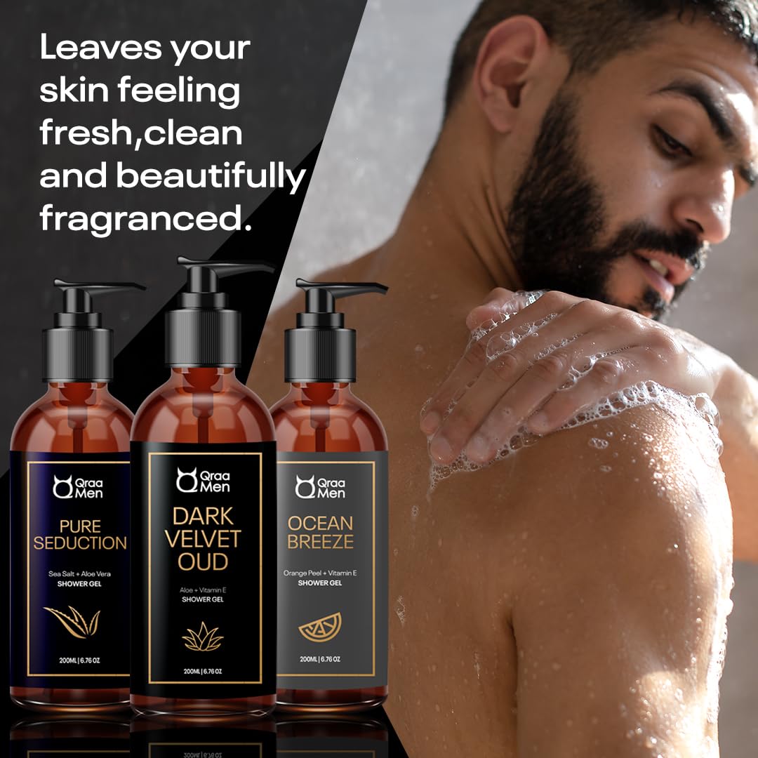 HomeBeautyFace CareSkincare Kits & CombosQraa Men Luxurious Shower Gel | With Long Lasting Fragrance | Calming & Relaxing Fragrance | With Aloe Vera Vitamin E & C| Pack of 3(600ML)