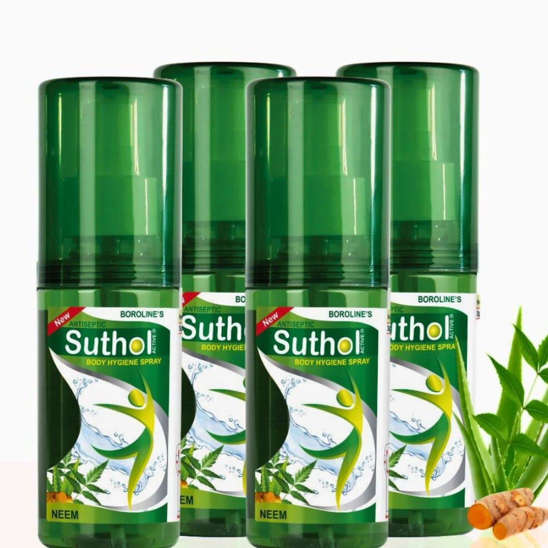 Suthol BOROLINE's Active Neem Spray 100 Ml X 4 | Stops Skin Irritations Prickly Heat Itching Rashes | With Neem Tumeric & Aloe Vera | Antiseptic Body Hygiene Spray (Pack Of 4)