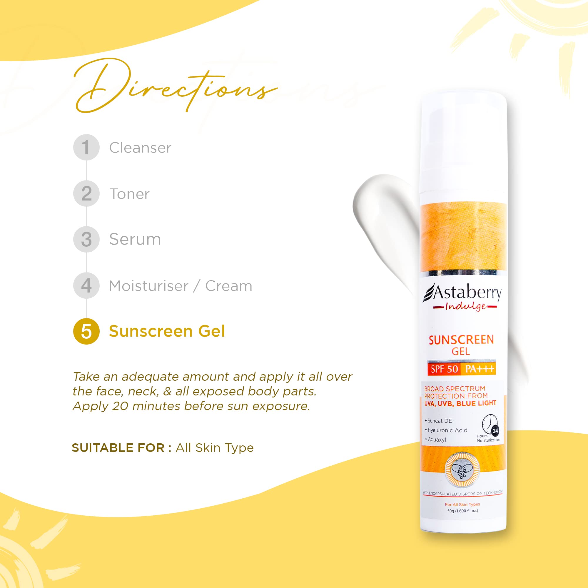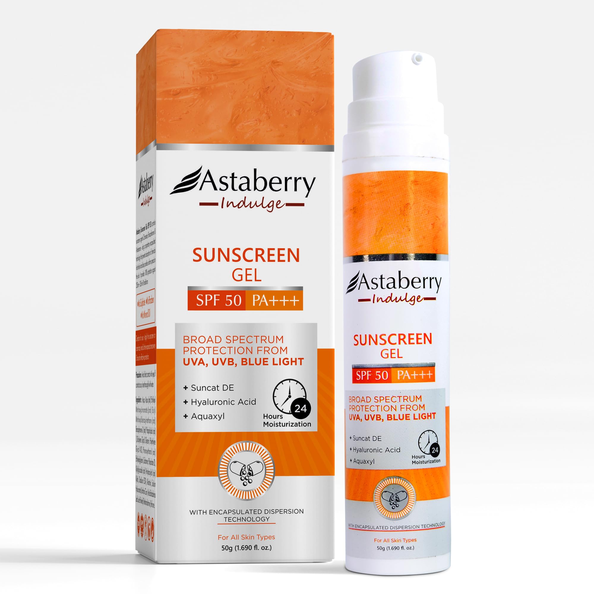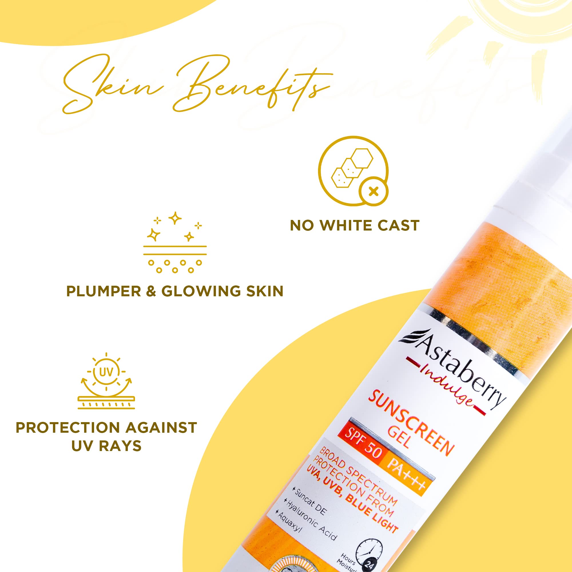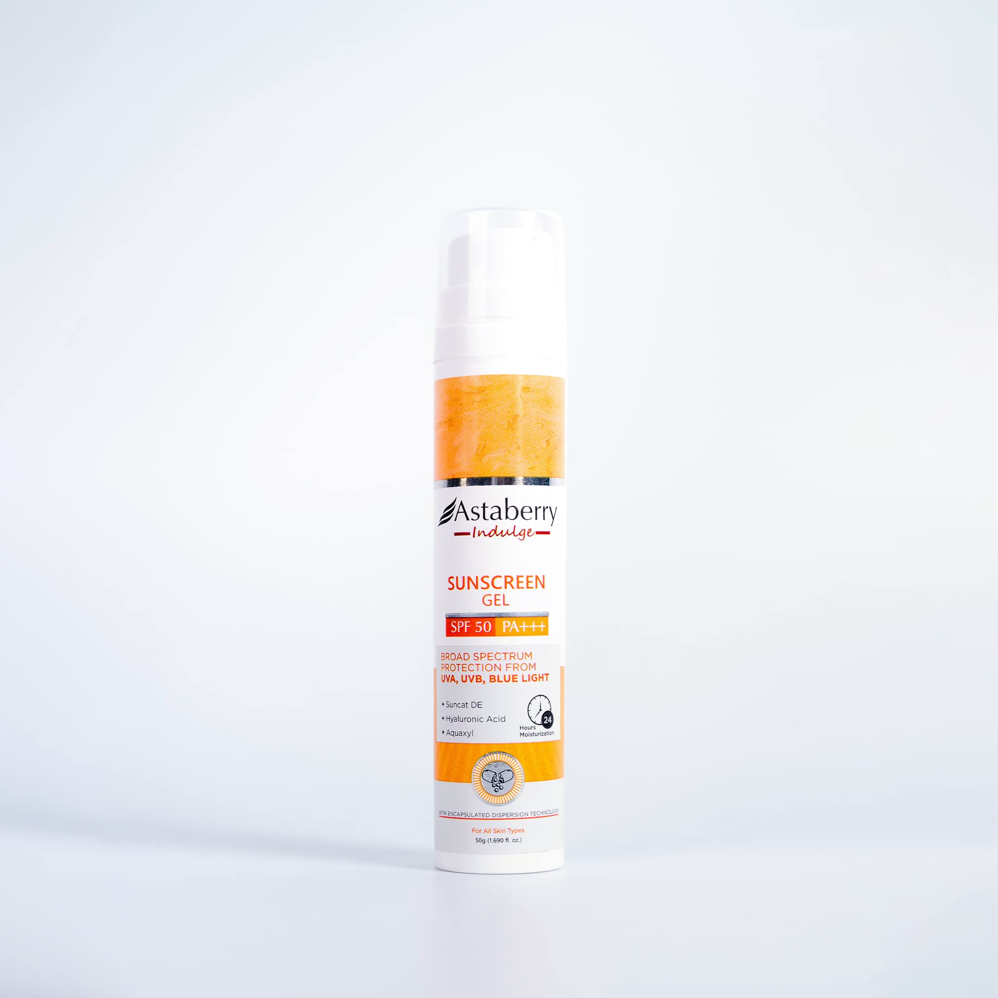 ASTABERRY Indulge Sunscreen Gel Suitable for All Skin Types SPF 50 PA+++ |Broad Spectrum Protection From UVA/B & Blue Light| Suncat DE & No White Cast | Light Weight & Non Greasy- 50G