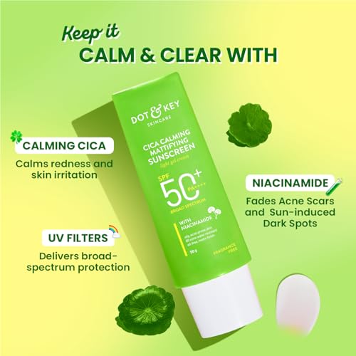 Dot & Keyâs sunscreen is made to give you a broad spectrum protection of PA ++++ with an SPF 50. It is super lightweight and quick absorbing that spreads well without leaving any white cast to give you maximum protection against all UVA UAB rays sunburns and photodamage. With added benefits of Cica & Niacinamide it also reverses the effects of sun exposure on your skin. Keep acne breakouts at bay with CICA+Niacinamide Oil-Free Moisturizer an ideal antidote for acne-prone oily & sensitive skin