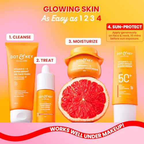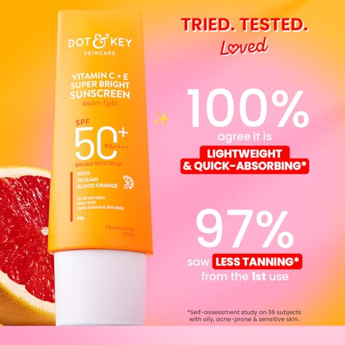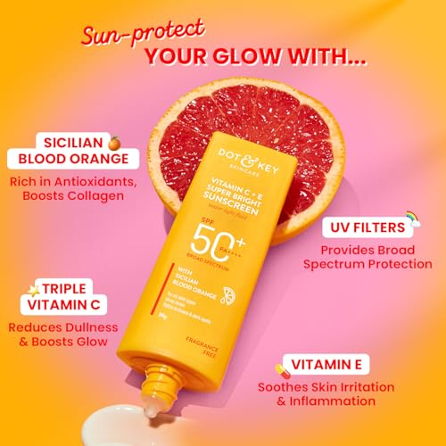 HomeBeautyFace CareSunscreenDOT & KEY Vitamin C + E Super Bright Sunscreen Spf 50 |Water-Light,UVA/UVB & Blue Light Protection|For Even Toned & Glowing Skin|With Liquid Spf 50+++| No White Cast| For All Skin Types| 50G,Pack Of 1
