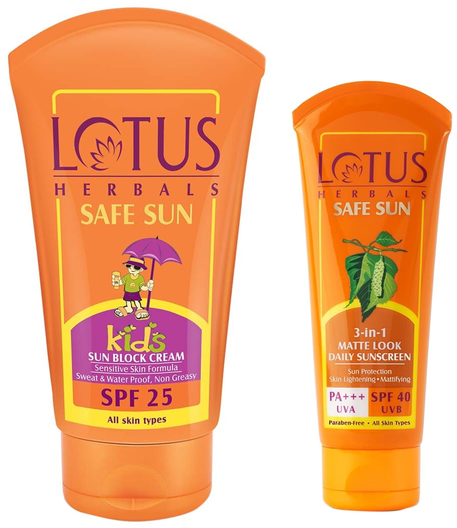 Lotus Herbals Safe Sun 3-In-1 Matte Look Daily Sunblock SPF-40, 50g & Safe Sun Kids Sun Block Cream SPF 25, 100g