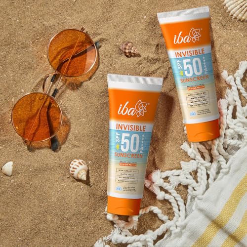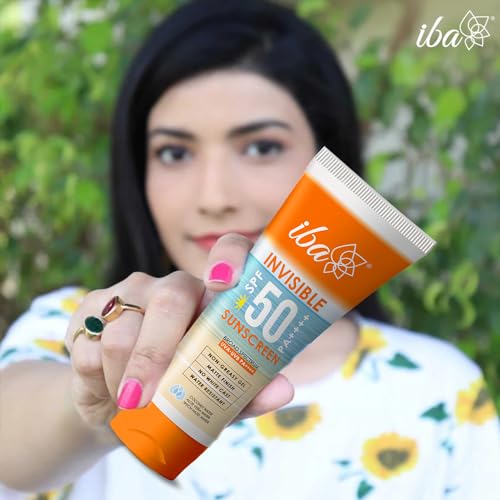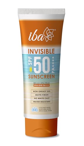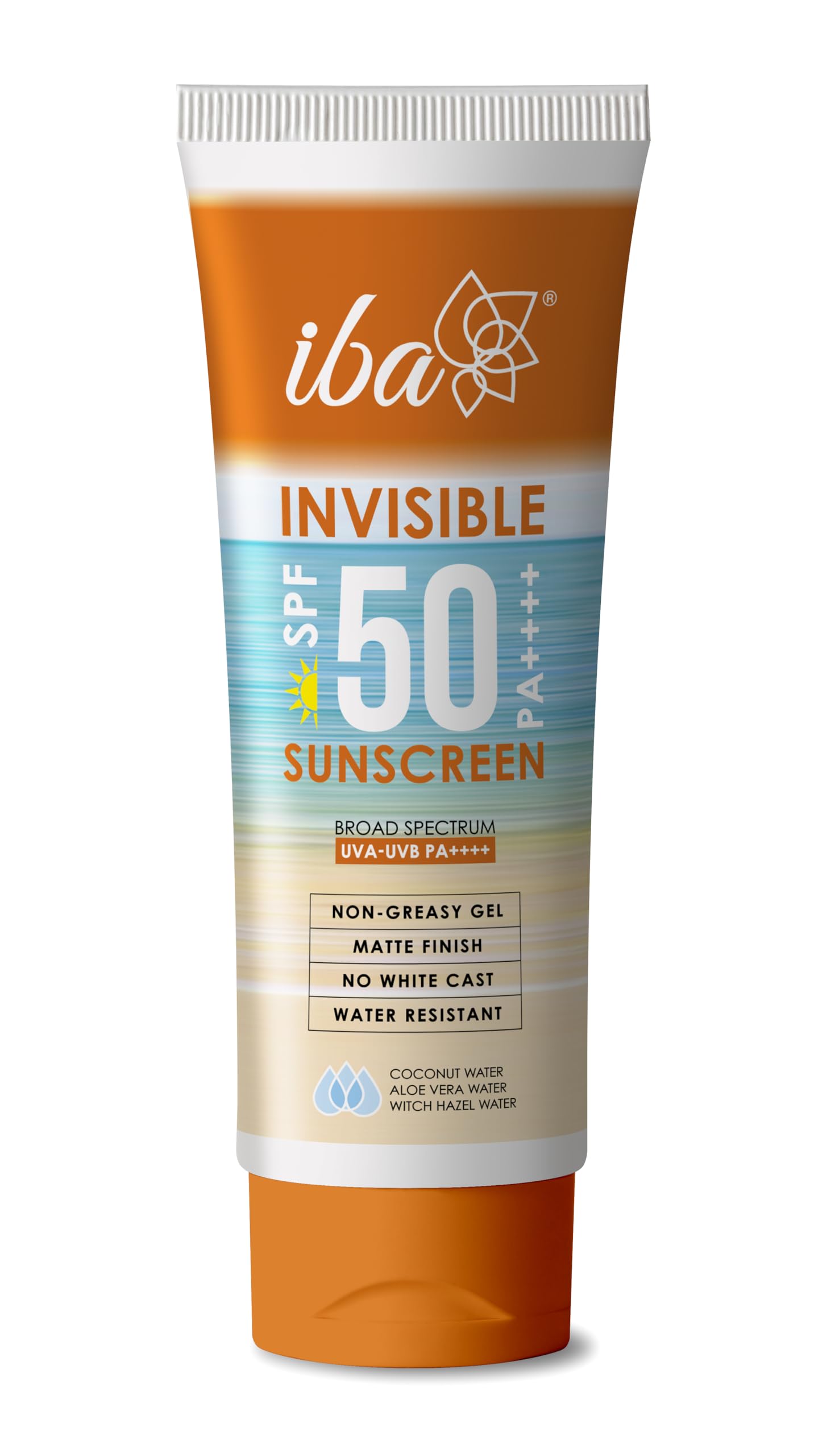 Iba invisible SPF 50 sunscreen: unique formula with intense broad spectrum protection + ultra-light invisible finish. Key Features: a) non-greasy | quick absorbing oil-free formula for daily use; b) ultra-light gel | does not clog pores and layers invisibly under makeup; c) matte finish | fresh clean matte look; d) no white cast | does not leave any white oily residue; e) water resistant | sweat-proof and long lasting. Unique blend of high performance UV filters blended with refreshing natural waters of coconut aloe and witch hazel to deliver ultra-light invisible finish with intense protection. 1. Coconut water rehydrates & refreshes; 2. Aloe vera water soothes & cools; 3. Witch hazel water fights acne & blemishes.