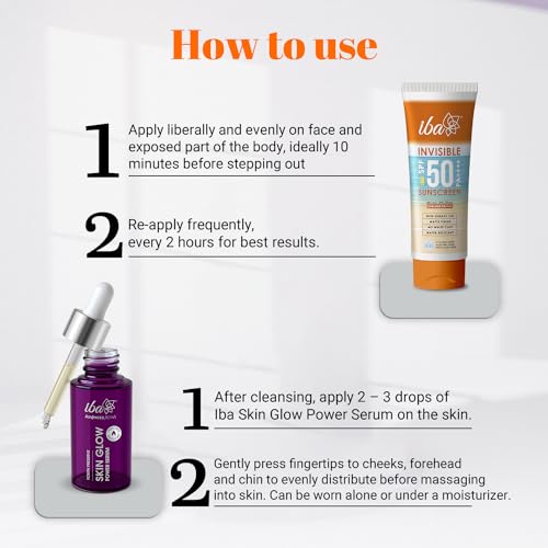 Iba Summer Special Skin Care Combo Vitamin C Serum 30ml + Matte Finish Sunscreen 100g | For Radiant Skin with Brighten Skin Tones and Sun SpotsIntroducing the Iba Summer Special Skin Care Combo a powerful duo that combines the benefits of Vitamin C Serum and Matte Finish Sunscreen to give you radiant and brightened skin. This combo includes a 30ml bottle of Vitamin C Serum and an 100g tube of Matte Finish Sunscreen providing comprehensive care for your skin during the summer months. Vitamin C Serum: The Vitamin C Serum is a potent formula enriched with Vitamin C known for its brightening and antioxidant properties. This serum helps to even out skin tone reduce the appearance of dark spots and hyperpigmentation and promote a radiant complexion. Its lightweight and fast-absorbing texture allows for easy application and effective penetration into the skin. Matte Finish Sunscreen: The Matte Finish Sunscreen is a must-have for sun protection during the summer. This sunscreen provides broad-spectrum UVA and UVB protection shielding your skin from harmful sun rays that can cause damage and premature aging. Its unique matte finish formula prevents excess shine and oiliness leaving your skin looking fresh and non-greasy even in hot and humid weather. Together the Vitamin C Serum and Matte Finish Sunscreen work in harmony to give you the ultimate summer skin care experience. The Vitamin C Serum brightens your complexion while the Matte Finish Sunscreen protects your skin from sun damage and helps maintain a shine-free look.