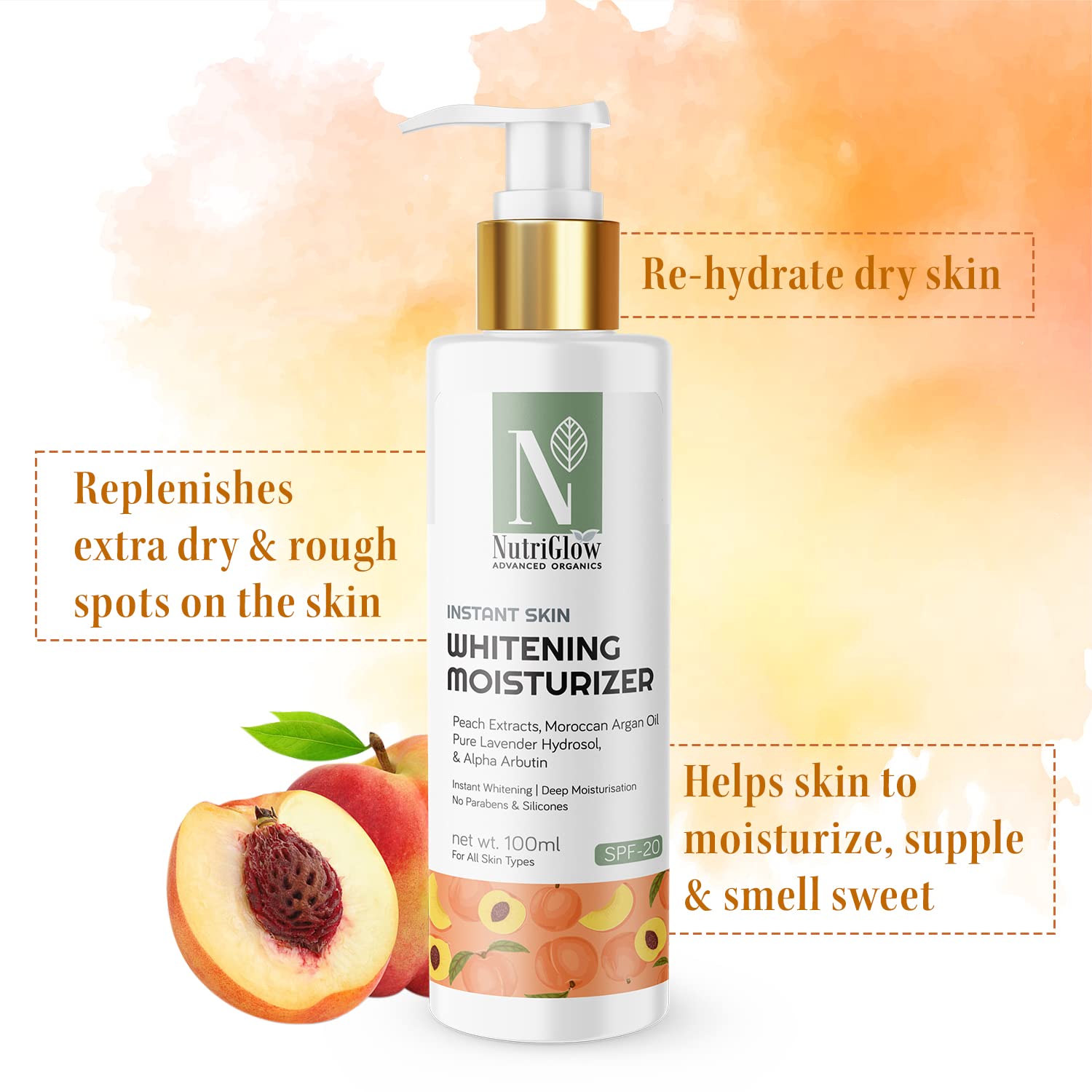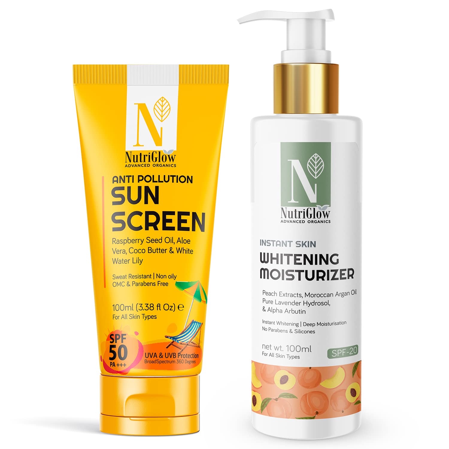 HomeBeautyFace CareSunscreenNutriGlow Advanced Organics Instant Skin Whitening Moisturizer & Anti Pollution Sunscreen SPF 30 PA+++ Non Greasy Lightweight For Dry Sensitive Tan Free Skin Refreshing Fragrance All Day 100ml Each Pack of 2