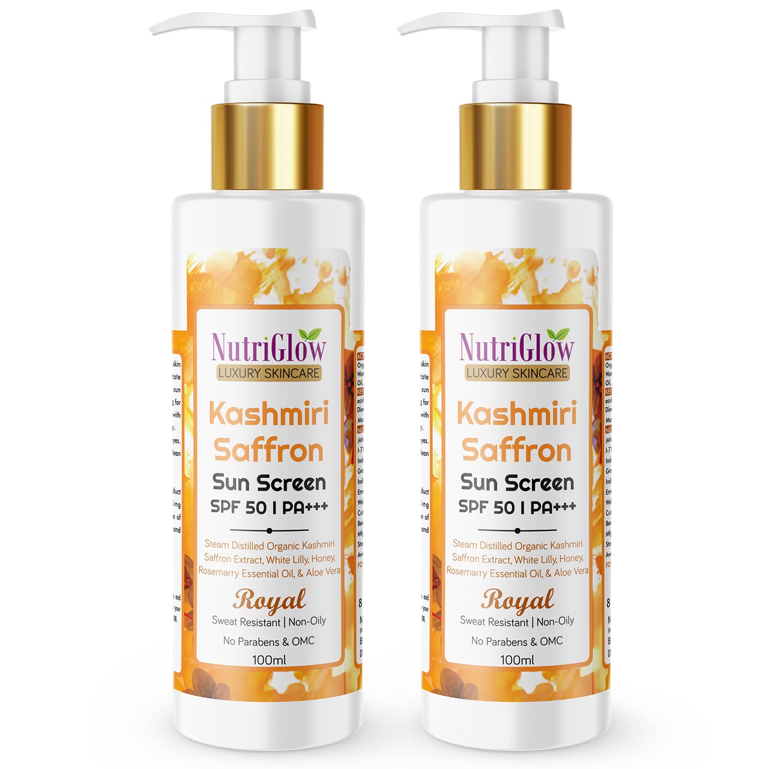 "NUTRIGLOW Kashmiri saffron sunscreen with SPF 50 powered with steam distilled organic Kashmiri saffron extract white water lilly chamomile rosemary essential oil honey and aloe vera reduces pollution induced skin irritations. The bio actives prevent signs of premature aging of skin pigmentation and skin darkening due to exposure to the sun. How to use: Apply generously on skin and massage gently to facilitate absorption 15 minutes before sun exposure. Ideal to use before going for a swim sun-bathing. Avoid contact with eyes. Re-apply frequently ".
