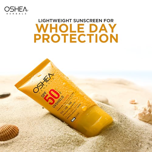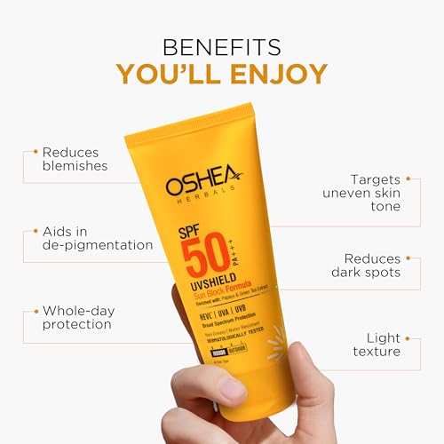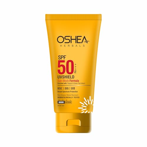Oshea herbals uvshield spf 50 sun block cream is a complete broad spectrum sun protection for all skin type. It is indicated to provide protection from ultraviolet hevl*uva and 1.1Vb rays to prevent sun burn tanning hyperpigmentation and premature ageing. It increases skin hydration. It is also a blend of natural herbal actives like papaya and green tea extract that deliver antioxidant benefits to help prevent free radical damage while nourishing and whitening skin.