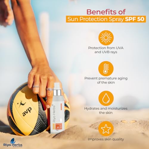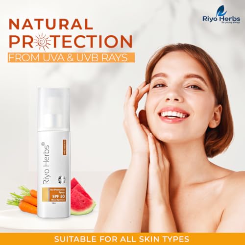 Riyoherbs Sun Protection is broad spectrum SPF50 spray which is a light weight non greasy daily use formula which protects skin from harmful UVA and UVB rays . It is enriched with the goodness of carrot oil watermelon extract vitamin E rich in Vitamin A & E that helps to avoid sun damage and fights signs of ageing.It,s non oily non patchy non sticky formula spreads evenly and gives a protected shield to the skin. The simple shake and spray sunscreen makes it very easy to use after applying any spf cream or moisturised skin can easily be applied after makeup to give the skin more protection during the day.Net Vol - 100mlIt is easy to carry and use Just spray on any exposed part of your body and spray it.Features:-Broad spectrum Spf 50 spray with the goodness of carrot oil watermelon extract Vitamin E.light weight formula as it is a non sticky non patchy non oily spray which does not leave white patches after use.Easy to use as you only have to shake and spray it all over your face on moisturized skin or even after makeup for extra protection.Reapply after every 2-3 hours and spray it all over your face and body when exposed to sun.Key ingredients:-Aqua octyl methoxycinnamate Octocrylene Avobenzone Oxybenzone Glycerine carrot oil watermelon liquid extract.No sulphate No Paraben no mineral oil no silicones no benzophenone.