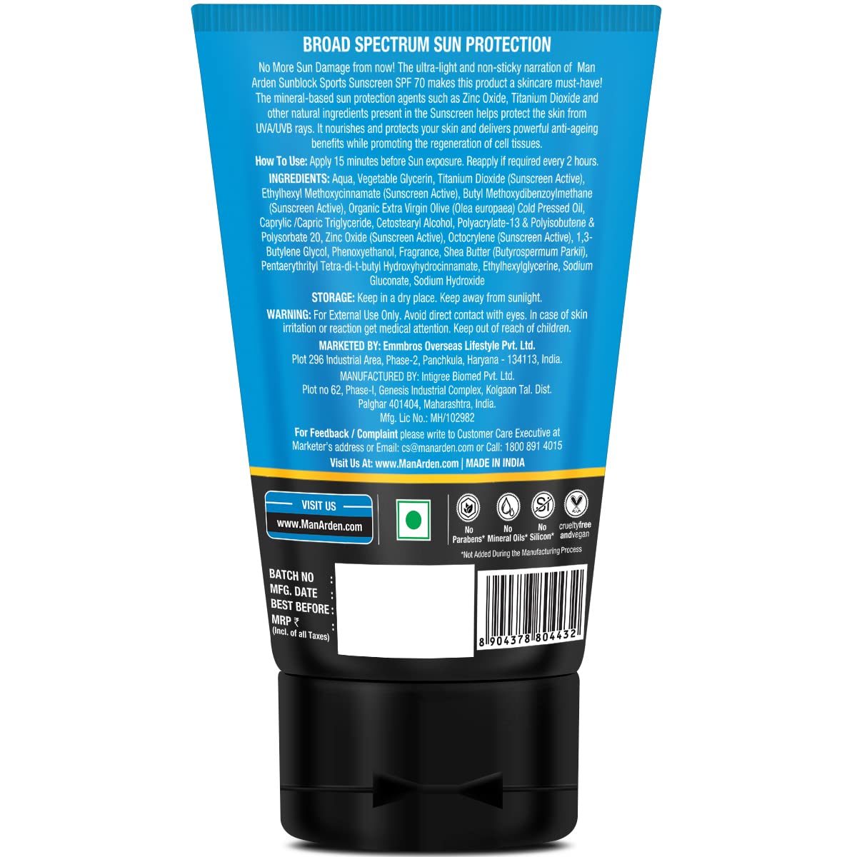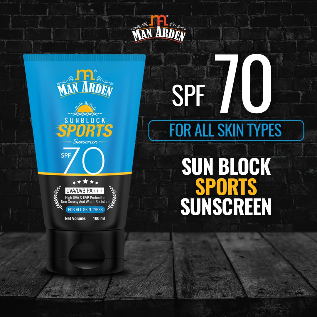 • SPF 70 High UVA/UVB Protection: Once you apply Man Arden Sunblock Sports Sunscreen with SPF 70 you'll get to know how lightweight it's formulation is. It offers your skin with broad-spectrum protection from the UVA/UVB rays of the sun. So go out without s
