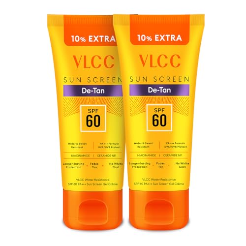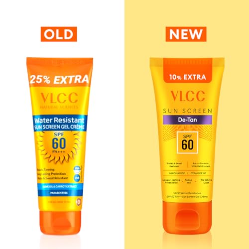 VLCC De-Tan Water Resistant SPF 60 PA+++ Sunscreen Gel Crème - 100g+10g Extra (Pack of 2) | With Niacinamide, Ceramides & Vitamin E | Protects from UVA, UVB Rays, Sun Damage, Skin Darkening & Premature Aging