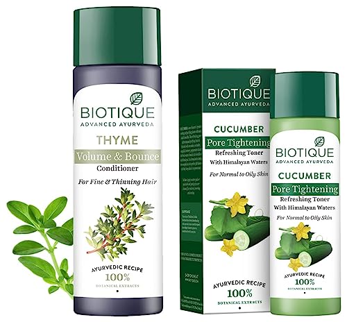 Biotique Bio Cucumber Pore Tightening Toner 120mlMake way for radiant skin with Biotique Bio Cucumber Pore Tightening Face Freshener. This Unisex formula can work on all skin types.This Biotique Face Freshener is a blend of natural ingredients like Cucumber Coriander Nutgalls Berberry Peppermint Oil and Pudina which combine to serve as effective toners and reduce the size of your pores. This solution purifies your skin by getting rid of microbes and other pollutants. This Cucumber Face Freshener tightens your pores and makes your skin healthier from within. This freshener does not contain alcohol and is safe to use on sensitive skin. The Biotique solution leaves your skin refreshed and smooth. This pore tightener also restores the pH balance of your skin. Now achieving glowing skin naturally is made simple with Biotique Cucumber Face freshener.Biotique Bio Thyme Volume Conditioner 200mlThyme is one of natures oldest and most vigorous herbs agent of strength and other medicinal powers. This volumizing formula is blended to condition and hydrate hair. Thickens follicles balances pH level and leaves hair feeling lightweight and l...