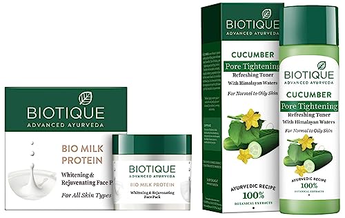 Biotique Bio Milk Protein Whitening & Rejuvenating Face Pack For All Skin Types 50GMilk Protein has been nature's moisture booster and lightening elixir since Cleopatra's legendary bath. The whitening and nourishing pack is blended with pure extracts of milk protein wheat germ almond oil honey and seaweed to moisturize and re...Biotique Bio Cucumber Pore Tightening Toner 120mlMake way for radiant skin with Biotique Bio Cucumber Pore Tightening Face Freshener. This Unisex formula can work on all skin types.This Biotique Face Freshener is a blend of natural ingredients like Cucumber Coriander Nutgalls Berberry Peppermint Oil and Pudina which combine to serve as effective toners and reduce the size of your pores. This solution purifies your skin by getting rid of microbes and other pollutants. This Cucumber Face Freshener tightens your pores and makes your skin healthier from within. This freshener does not contain alcohol and is safe to use on sensitive skin. The Biotique solution leaves your skin refreshed and smooth. This pore tightener also restores the pH balance of your skin. Now achieving glowing skin naturally is made simple with Biotique Cucumber Face freshener.