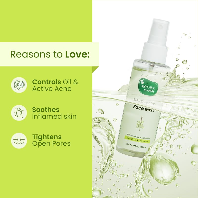Mother Sparsh Tulsi & Tea Tree Face Mist | Face Toner With Green Tea & Calendula for Sensitive Skin | Calms & Tightens Pores | Lightweight & Non-Sticky | Alcohol Free Toning Mist | 100ml