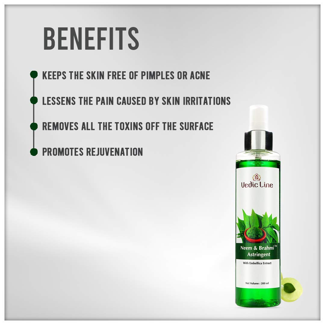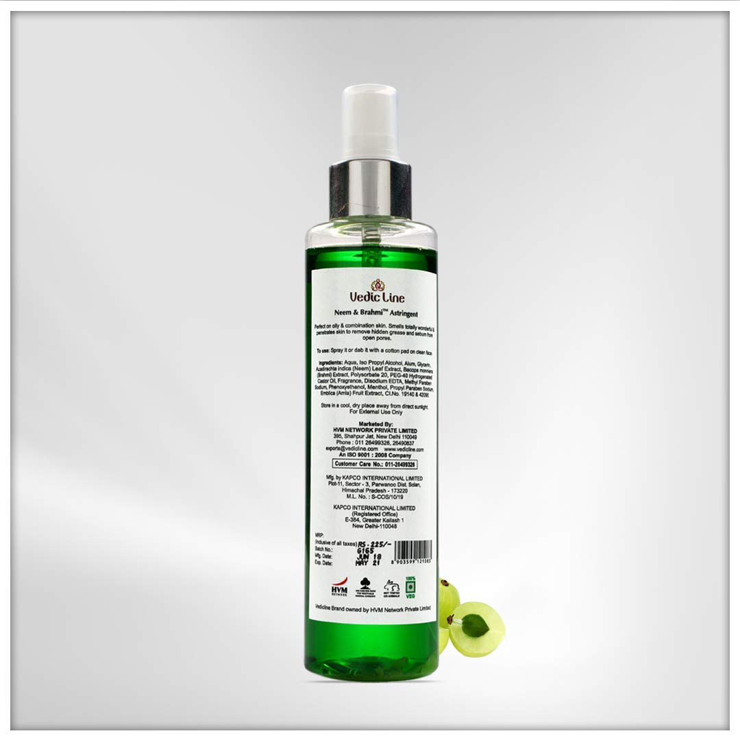 • Vedicline Neem & Brahmi Astringent it's light and free of alcohol. It effectively regulates the pH levels of the skin s the presence of visible pores and energize the skin quickly.
