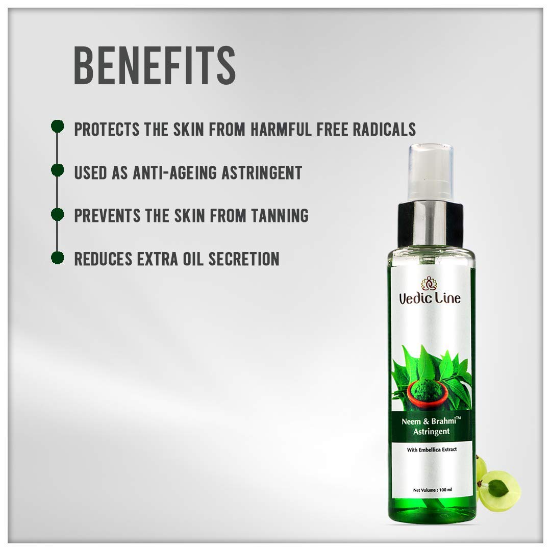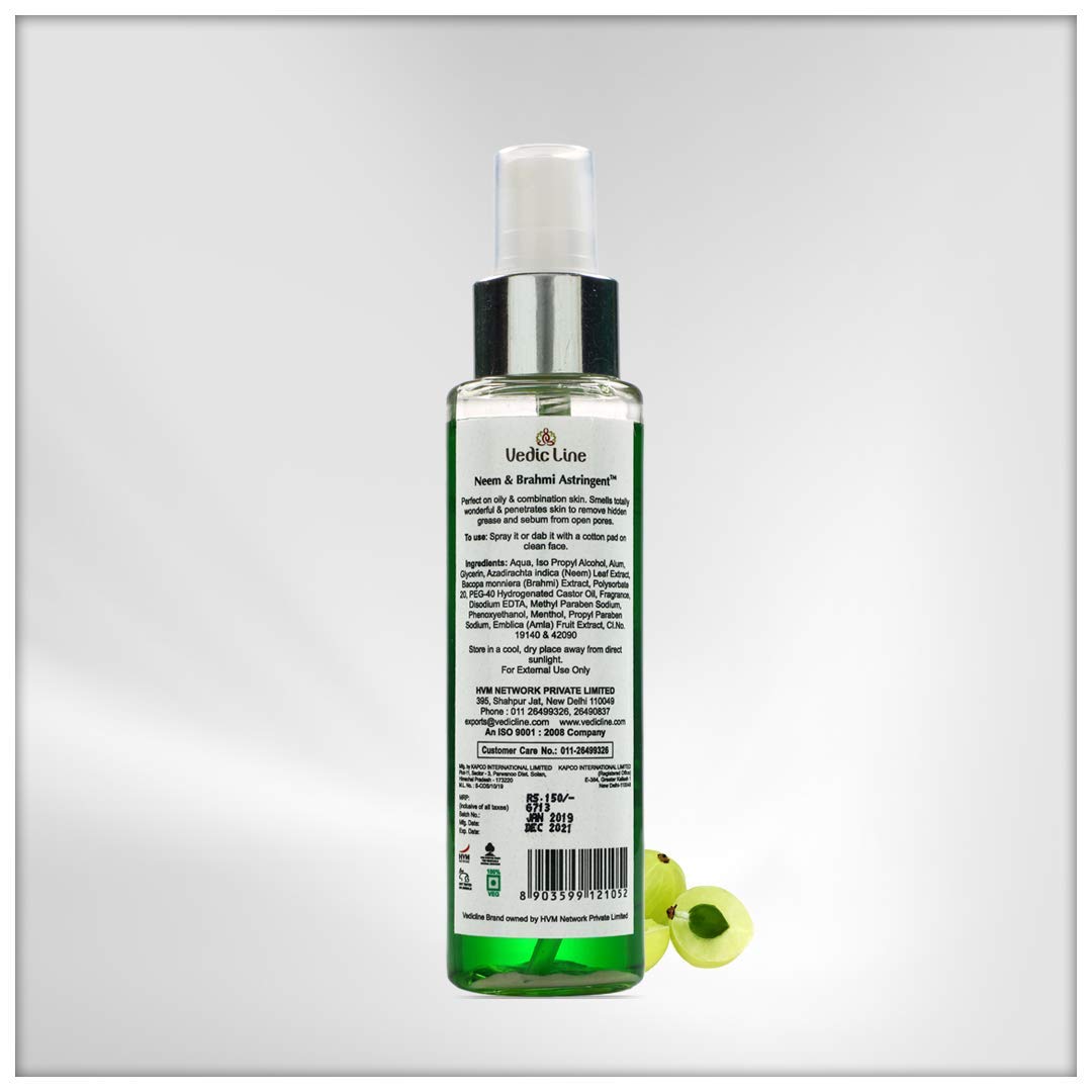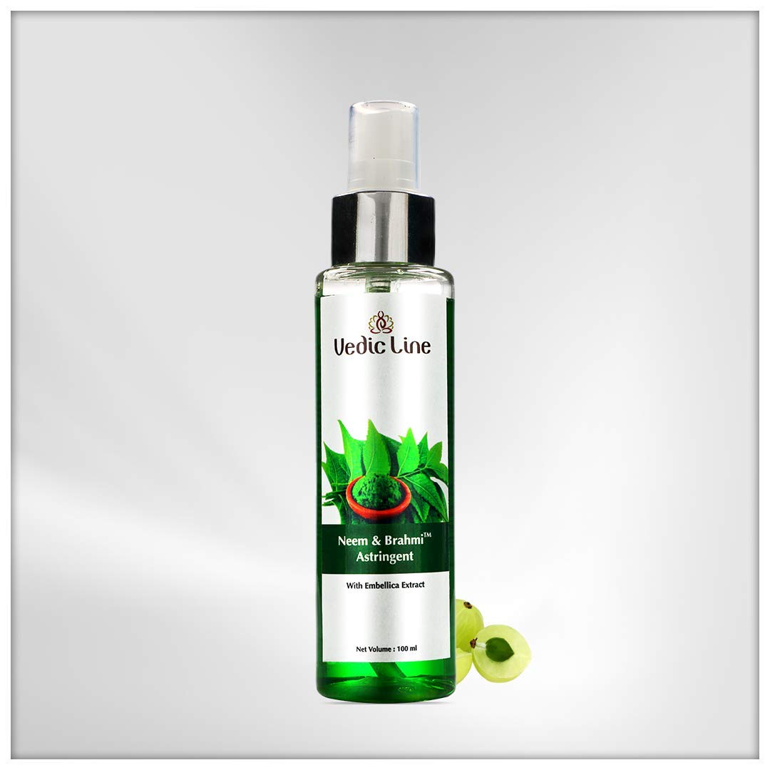 The vedic line astringent is enriched pure embellica extracts which remove deep hidden grease and sebum from open pores. Neem an effective antiseptic prevents acne breakouts and brahmi nourishes the skin.