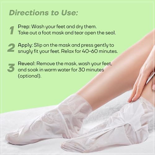 • USAGE : To use the foot mask you would typically wear the booties for a specified time allowing the exfoliating ingredients to penetrate the skin and dissolve dead skin cells. Over the next few days the outer layer of skin on your feet will start to peel