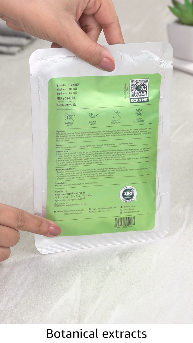 • INGREDIENTS : exfoliating ingredients such as alpha hydroxy acids (AHAs) or beta hydroxy acids (BHAs) along with moisturizing agents to help soften the skin. & 30+ botanical extracts like Calendula Sea Kelp Thyme etc.