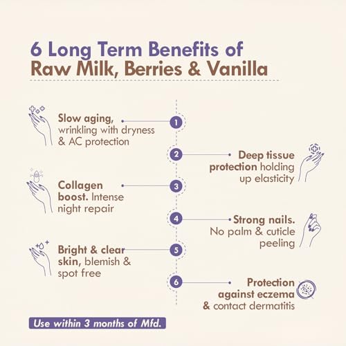 Nat Habit Fresh made Ayurveda Certified Hand Malai for special protection of palms fingers & nails. Its made of Fresh Milk and is Glycerin Free. It softens & repairs skin while hydrating & protecting skin against dryness and roughness. Packed with active anti-oxidants of mulberries blackberries & raspberries and the goodness of sunflower seeds olive oil shea butter vanilla & raw milk the malai keeps skin super soft elastic & baby like. Our hands tend to age and wrinkle the fastest and need special care frequently. The Hand Malai gives them perfect protection!