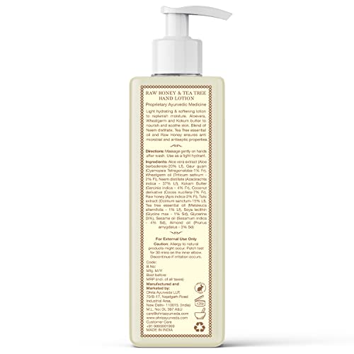 Hydrating & softening lotion to replenish moisture Wheat germ Aloevera & Kokum butter to nourish & soothe skin. Blend of Neem distillate Tea Tree essential oil and Raw Honey ensures anti microbial and antiseptic properties. Ingredients:- Gaur guam Neem distillate coconut derivativeRaw honey Wheatgerm oil Tea tree essential oil Aloe vera extract Tulsi Extract Soya Lecithin Kokam Butter Glycerine Almond oil Sesame oil
