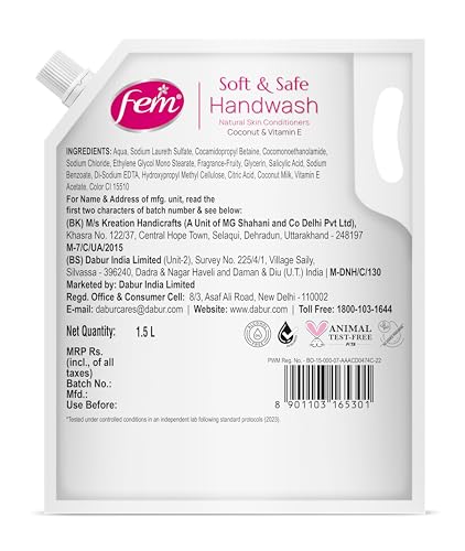 Germ removal doesnât mean your hand wash has to be harsh for your skin. Fem Soft & Safe Handwash is enriched with Natural Skin Conditioners like Coconut Milk and Vitamin E that remove 99.9% germs and leave your skin moisturized. It provides complete care for your hands i.e it leaves hands Soft & Hygienically clean. Maintains pH balance of skin and has no added Parabens Triclosan and Triclocarbon