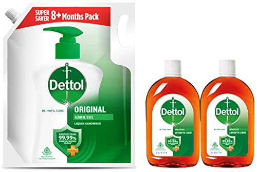 Dettol Antiseptic Disinfectant liquid for First aid Surface Cleaning and Personal Hygiene 250ml Pack of 2Dettol Antiseptic Liquid protects you and your family from 100 illness causing germs. It comes in a fresh pine fragrance. The topical antiseptic liquid sanitizes your home and helps maintain your personal hygiene. The Dettol first aid antiseptic liquid can be used to protect against infection from cuts and scratches disinfect toys and sanitize baby wear leaving everything clean and fresh. It can also be used as a household disinfectant and cleaner on surfaces or in laundry cleaning to kill germs. This liquid antiseptic is recommended by Indian Medical Association and can be kept in your emergency first aid kit. USAGE: Recommended dilutions to protect your family from germs: Bathing â 5ml to a bucket of water (10 litres); First Aid- 15ml to 300ml of water; Shaving Antiseptic Liquid- 15ml to 300ml of water; Nappy Wash â 12.5ml to 500ml of wateDettol Liquid Handwash Refill - Original Germ Protection Hand Wash- 1500ml | Antibacterial Formula | 10x Better Germ ProtectionBe 100% sure to protect your skin from 100 illness-causing germs and bacteria. Use Dettol's Original Germ Protection Handwash Liquid Soap pH balanced formula every day and keep your hands hygienically clean and refreshed. This hand wash provides soft and rich lather leaving behind clean hands and mild pine fragrance. The trusted germ-protection modus operandi acts like a barrier between your hands and a wide range of unseen germs. The soap-free formula with glycerin makes sure to keep your skin moisturised while the plant derived cleansers help ensure thorough cleaning. Dettol handwash also contains more than 85% naturally derived ingredients with no TCC & Triclosan giving another healthy reason for hand washing whenever in need. Wash hands properly with Dettol and help keep your family healthy! Safety Information: Keep out of reach of children unless under adult supervision. Avoid direct contact with eyes. For external use. In case of contact with eyes rinse immediately with plenty of water. If persistent irritation occurs seek medical attention.