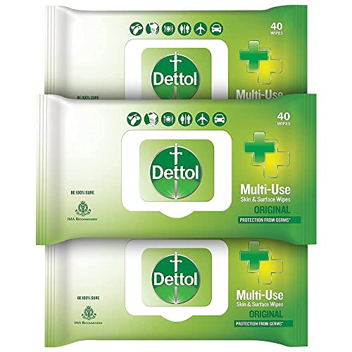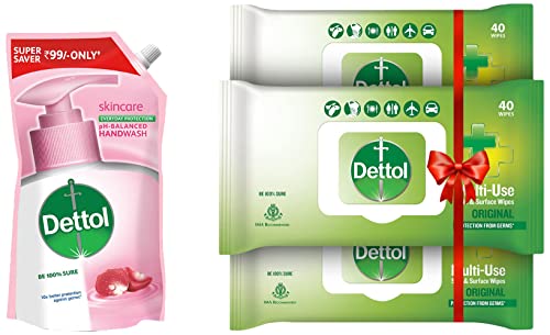 Dettol Disinfectant Sanitizer Wet Wipes for Skin & Surfaces Original (Pack of 3 40 Count each) | Moisture-Lock Lid | Safe on Skin | Ideal to Clean SurfacesDettol's Disinfecting Skin & Surface Wipes are Safe on Skin Ideal to Clean Multiple Surfaces Easy to carry with a resealable Moisture-lock lid. Dettol disinfecting wipes are practical for everyday use on furniture taps sinks door knobs kitchen bathroom surfaces floor cleaning childrenâs surfaces and places that are germ hotspots. It can be used on most hard non-porous surfaces including Finished Wood Sealed Marble Stainless Steel Laminated Floors Glass and Plastic.Dettol Liquid Handwash Refill - Skincare Moisturizing Hand Wash 750 ml | Antibacterial Formula | 10x Better Germ ProtectionBe 100% sure to protect your skin from 100 illness-causing germs and bacteria. Use Dettol's Skincare Germ Protection Handwash Liquid Soap pH balanced formula every day and keep your hands hygienically clean and refreshed. This hand wash provides soft and rich lather leaving behind clean hands and fragrance. The trusted germ-protection modus operandi acts like a barrier between your hands and a wide range of unseen germs. The soap-free formula with glycerin makes sure to keep your skin moisturised while the plant derived cleansers help ensure thorough cleaning. Dettol handwash also contains more than 85% naturally derived ingredients with no TCC & Triclosan giving another healthy reason for hand washing whenever in need. Wash hands properly with Dettol and help keep your family healthy! Safety Information: Keep out of reach of children unless under adult supervision. Avoid direct contact with eyes. For external use. In case of contact with eyes rinse immediately with plenty of water. If persistent irritation occurs seek medical attention.