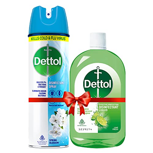 Dettol Disinfectant Cleaner for Home Lime Fresh â 1LLiquid Lime Fresh 1L Germs are found everywhere - lingering on surfaces in our clothes and even on our skin often exposing us and our kids to harmful bacterias and illness. Anything from e-coli to influenza can spread rapidly. It can multiply up to 8 million times in just one day! Dettol Disinfectant Multi-purpose Cleaner for Home provides expert protection against harmful bacteria with a unique sanitizing formula. This liquid has been specially developed to leave in your home and on your laundry a nice and pleasant smell while it also doubles as a sanitizer. It contains Dettolâs trusted formula that takes care of you and your family from harmful germs. The multi- purpose liquid disinfects everything in your home and is useful for Home hygiene and Personal care - for germ free floor or laundry sanitization. Dermatologically tested it is safe on skin and therefore is absolutely safe to be used for bathing. This product is also recommended by Indian Medical Association. Oh did we mention this not just disinfects but also freshens up your home and you and it is available in 2 refreshing fragrances: Lime Fresh and Menthol Cool. Recommended dilutions to protect your family from germs: Floor Cleaning: 1 capful to a litre of water Laundry: 1 capful to a litre of water in the last rinse Kitchen Slab: 1 capful to a litre of water Refrigerator: 1 capful to a litre of water Bathing: 1 capful to a bucket of water (10 litres) Shaving: 1 capful to a litre of water.Dettol Multi-Purpose Disinfectant Spray For Hard & Soft Surfaces Spring Blossom- 170 gDettol disinfectant spray provides protection to you and your family against illness causing germs bacteria and viruses. This alcohol (denatured) surface disinfectant spray sanitizes your home and eliminates odour causing bacteria. It helps in killing cold and flu viruses including h1n1 virus. Dettol disinfectant spray can be used in toilet area dustbin kitchen sink shower bases taps sofas curtains carpets car seats etc. Leaving everything clean and fresh. It safely kills germs on everyday items and leaves behind a pleasant pine fragrance. This multipurpose disinfectant cleaner for home is recommended by Indian medical association. Usage: Shake dettol disinfectant spray well. Hold spray 15-20 cm from pre cleaned surface and spray surface until covered with mist. Allow to air dry no need to wipe. Do not use on polished wood painted surface or acrylic plastics.