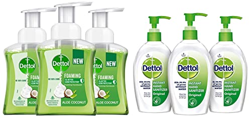 Dettol Foaming Handwash Pump - Aloe Coconut (Pack of 3-250ml each) | Rich Foam | Moisturizing Hand Wash | Soft on HandsBe 100% sure to protect your skin from germs and bacteria. Dettol foaming handwash is a moisture-rich foam that removes dirt and germs while being gentle on skin. This hand wash provides soft and rich lather leaving behind clean hands and mild aloe coconut fragrance. Dettol handwash is dermatologically tested. Dettol handwash are free from parabens/ TCC and are ph balanced.Dettol Original Germ Protection Alcohol based Hand Sanitizer Pump 200ml (Pack of 3)DETTOL Hand Sanitizer is protection on the go; whether you are using a public toilet public transport or simply eating outside use DETTOL Sanitizer that offers water-less protection against germs. DETTOL hand sanitizer is specially formulated to protect you from 100 illness causing germs withot the use of soap and water. This rinse free and non-sticky sanitizer is recommended by Indian Medical Association. USAGE: Squirt a thumbnail amount onto the palms. Spread sanitizer and rub palms together. Rub tips of each hand with palm of other hand. Rub hands together until they are dry.