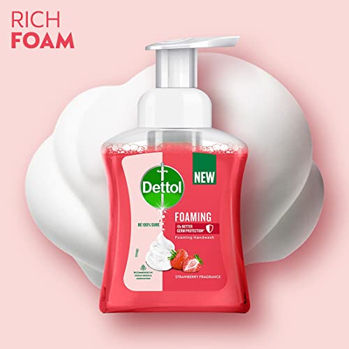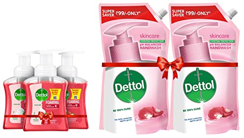 Dettol Foaming Handwash Pump - Strawberry (Pack of 3-250ml each) | Rich Foam | Moisturizing Hand Wash | Soft on HandsBe 100% sure to protect your skin from germs and bacteria. Dettol foaming handwash is a moisture-rich foam that removes dirt and germs while being gentle on skin. This hand wash provides soft and rich lather leaving behind clean hands and mild strawberry fragrance. Dettol handwash is dermatologically tested. Dettol handwash are free from parabens/ TCC and are ph balanced.Dettol Liquid Handwash Refill - Skincare Moisturizing Hand Wash (Pack of 2 - 750ml each) | Antibacterial Formula | 10x Better Germ ProtectionBe 100% sure to protect your skin from 100 illness-causing germs and bacteria. Use Dettol's Skincare Germ Protection Handwash Liquid Soap pH balanced formula every day and keep your hands hygienically clean and refreshed. This hand wash provides soft and rich lather leaving behind clean hands and fragrance. The trusted germ-protection modus operandi acts like a barrier between your hands and a wide range of unseen germs. The soap-free formula with glycerin makes sure to keep your skin moisturised while the plant derived cleansers help ensure thorough cleaning. Dettol handwash also contains more than 85% naturally derived ingredients with no TCC & Triclosan giving another healthy reason for hand washing whenever in need. Wash hands properly with Dettol and help keep your family healthy! Safety Information: Keep out of reach of children unless under adult supervision. Avoid direct contact with eyes. For external use. In case of contact with eyes rinse immediately with plenty of water. If persistent irritation occurs seek medical attention.